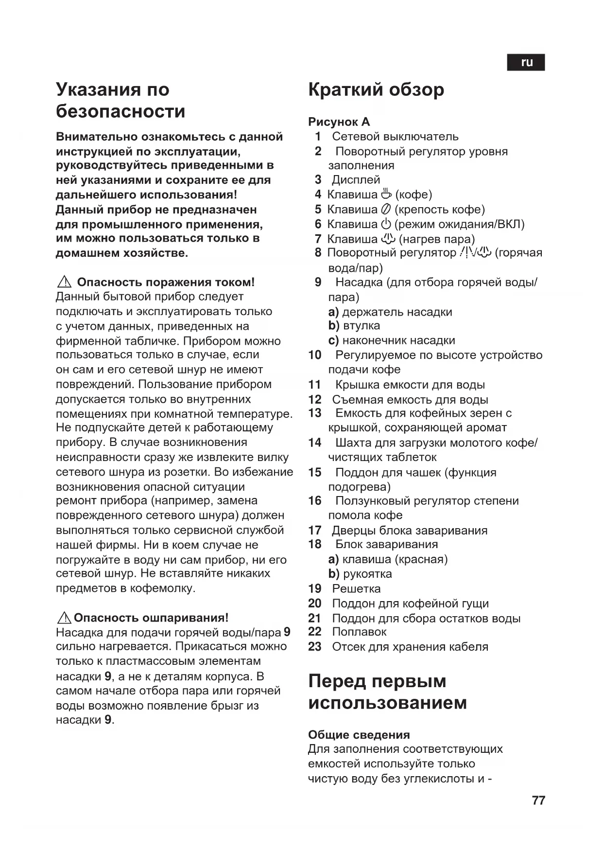 17 Дверцыблоказаваривания 18 Блокзаваривания a)клавиша(красная) b)рукоятка 19 Решетка 20 Поддондлякофейнойгущи 21 Поддондлясбораостатковводы 22 Поплавок 23 Отсекдляхранениякабеля Перед первым использованием Общие сведения Длязаполнениясоответствующих емкостейиспользуйтетолько чистуюводубезуглекислотыи78 предпочтительносмесикофейных зерен,предназначенныедля автоматическихкофеварок.Не используйтекофейныезерна, обработанныесприменением глазированных,карамелизованныхили другихсахаросодержащихдобавок,они закупориваюткофемолку.Определите жесткостьиспользуемойводыс помощьюприлагаемойконтрольной полоски.Еслижесткостьводыпо результатамтестанесоответствует степени4,произведитесоответствующее программированиеприбора(см.раздел «Настройкажесткостиводы»). Первое включение прибора ●Вытянитесетевойшнурна соответствующуюдлинуизотсека дляхранениякабеляивставьтеегов