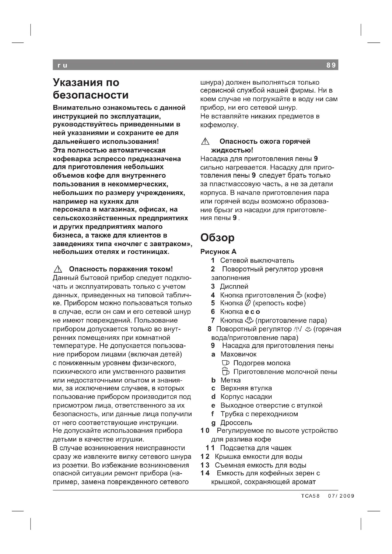 Указания по безопасности Внимательно ознакомьтесь с данной инструкцией по эксплуатации, руководствуйтесь приведенными в ней указаниями и сохраните ее для дальнейшего использования! Эта полностью автоматическая кофеварка эспрессо предназначена для приготовления небольших объемов кофе для внутреннего пользования в некоммерческих, небольших по размеру учреждениях, например на кухнях для персонала в магазинах, офисах, на сельскохозяйственных предприятиях и других предприятиях малого бизнеса, а также для клиентов в заведениях типа «ночлег с завтраком», небольших отелях и гостиницах.