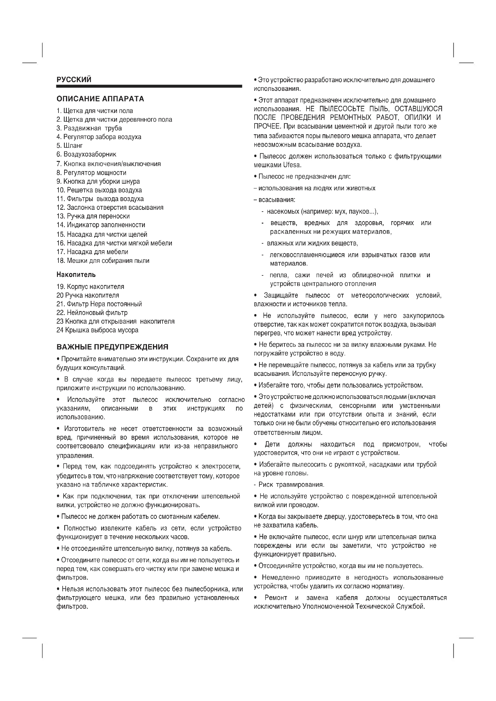 23 Кнопка для открывания накопителя 24 Крышка выброса мусора ВАЖНЫЕ ПРЕДУПРЕЖДЕНИЯ
