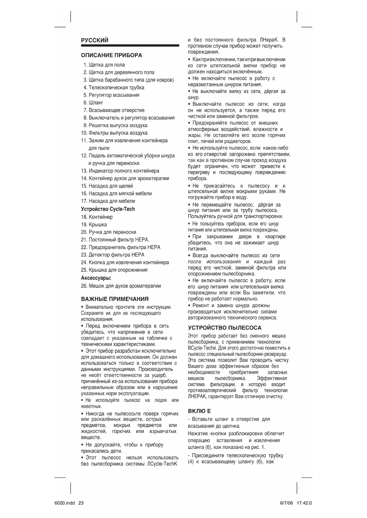 - Этот пылесос нельзя использовать без пылесборника системы ЛCycle-TechК и без постоянного фильтра ЛHepaК. В противном случае прибор может получить повреждения.