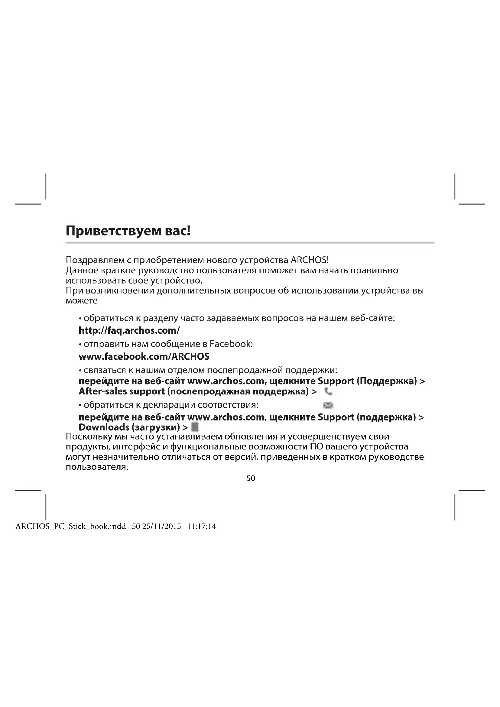 - обратиться к декларации соответствия: перейдите на веб-сайт www.archos.com, щелкните Support (поддержка) > Downloads (загрузки) > Поскольку мы часто устанавливаем обновления и усовершенствуем свои продукты, интерфейс и функциональные возможности ПО вашего устройства могут незначительно отличаться от версий, приведенных в кратком руководстве пользователя. Приветствуем вас! ARCHOS_PC_Stick_book.indd 50 25/11/2015 11:17:1451