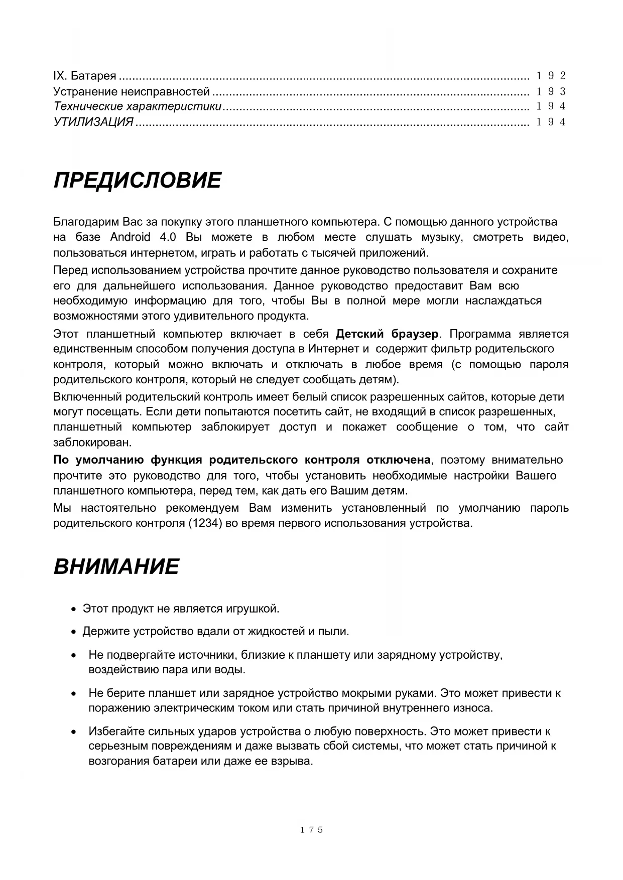 IX. Батарея ........................................................................................................................... 192 Устранение неисправностей ............................................................................................... 193 Технические характеристики ............................................................................................ 194 УТИЛИЗАЦИЯ ...................................................................................................................... 194 ПРЕДИСЛОВИЕ Благодарим Вас за покупку этого планшетного компьютера. С помощью данного устройства на базе Android 4.0 Вы можете в любом месте слушать музыку, смотреть видео, пользоваться интернетом, играть и работать с тысячей приложений. Перед использованием устройства прочтите данное руководство пользователя и сохраните его для дальнейшего использования. Данное руководство предоставит Вам всю необходимую информацию для того, чтобы Вы в полной мере могли наслаждаться возможностями этого удивительного продукта. Этот планшетный компьютер включает в себя Детский браузер. Программа является единственным способом получения доступа в Интернет и содержит фильтр родительского контроля, который можно включать и отключать в любое время (с помощью пароля родительского контроля, который не следует сообщать детям). Включенный родительский контроль имеет белый список разрешенных сайтов, которые дети могут посещать. Если дети попытаются посетить сайт, не входящий в список разрешенных, планшетный компьютер заблокирует доступ и покажет сообщение о том, что сайт заблокирован. По умолчанию функция родительского контроля отключена, поэтому внимательно прочтите это руководство для того, чтобы установить необходимые настройки Вашего планшетного компьютера, перед тем, как дать его Вашим детям. Мы настоятельно рекомендуем Вам изменить установленный по умолчанию пароль родительского контроля (1234) во время первого использования устройства.
