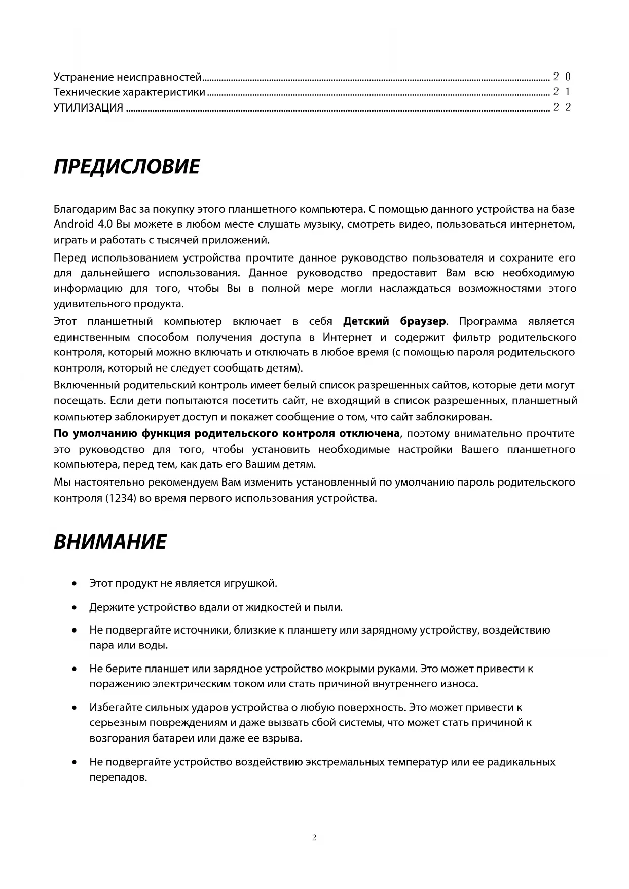 Устранение неисправностей .................................................................................................................................................. 20 Технические характеристики ................................................................................................................................................ 21 УТИЛИЗАЦИЯ .................................................................................................................................................................................. 22 ПРЕДИСЛОВИЕ Благодарим Вас за покупку этого планшетного компьютера. С помощью данного устройства на базе Android 4.0 Вы можете в любом месте слушать музыку, смотреть видео, пользоваться интернетом, играть и работать с тысячей приложений. Перед использованием устройства прочтите данное руководство пользователя и сохраните его для дальнейшего использования. Данное руководство предоставит Вам всю необходимую информацию для того, чтобы Вы в полной мере могли наслаждаться возможностями этого удивительного продукта. Этот планшетный компьютер включает в себя Детский браузер. Программа является единственным способом получения доступа в Интернет и содержит фильтр родительского контроля, который можно включать и отключать в любое время (с помощью пароля родительского контроля, который не следует сообщать детям). Включенный родительский контроль имеет белый список разрешенных сайтов, которые дети могут посещать. Если дети попытаются посетить сайт, не входящий в список разрешенных, планшетный компьютер заблокирует доступ и покажет сообщение о том, что сайт заблокирован. По умолчанию функция родительского контроля отключена, поэтому внимательно прочтите это руководство для того, чтобы установить необходимые настройки Вашего планшетного компьютера, перед тем, как дать его Вашим детям. Мы настоятельно рекомендуем Вам изменить установленный по умолчанию пароль родительского контроля (1234) во время первого использования устройства.