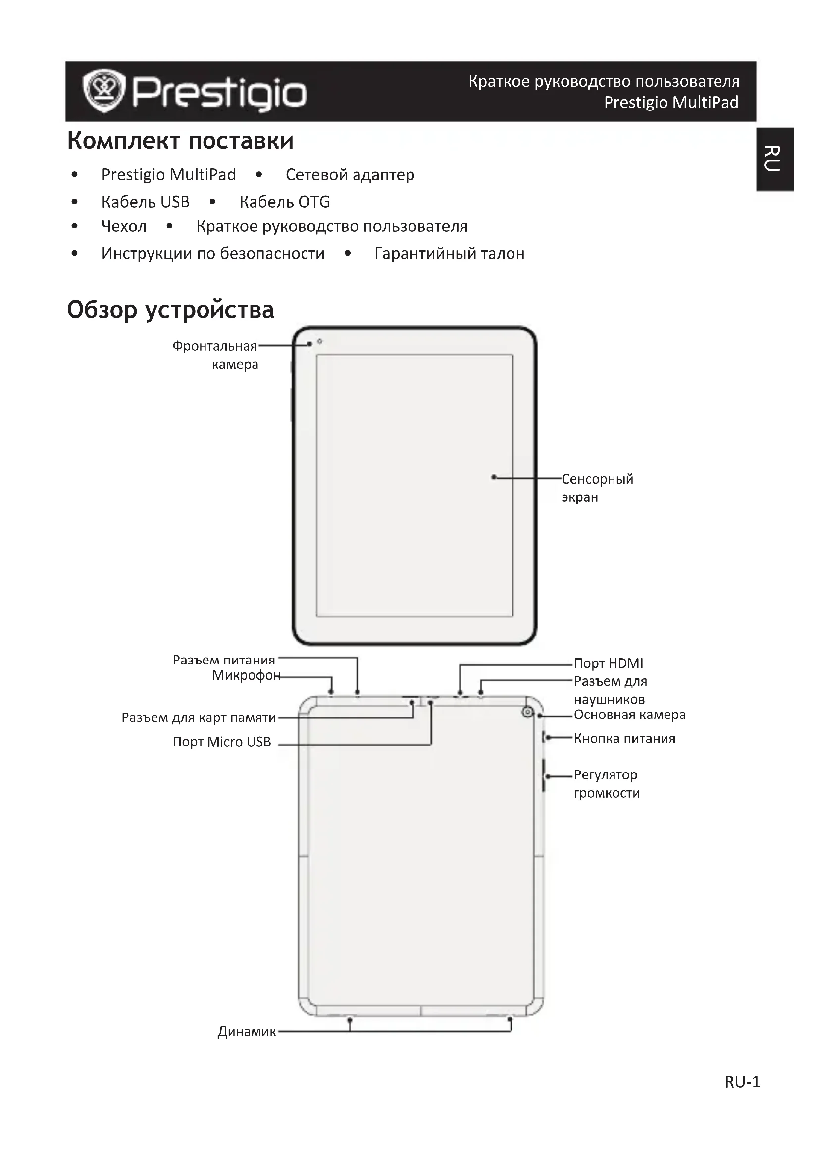 Краткое руководство пользователя Prestigio MultiPad Комплект поставки