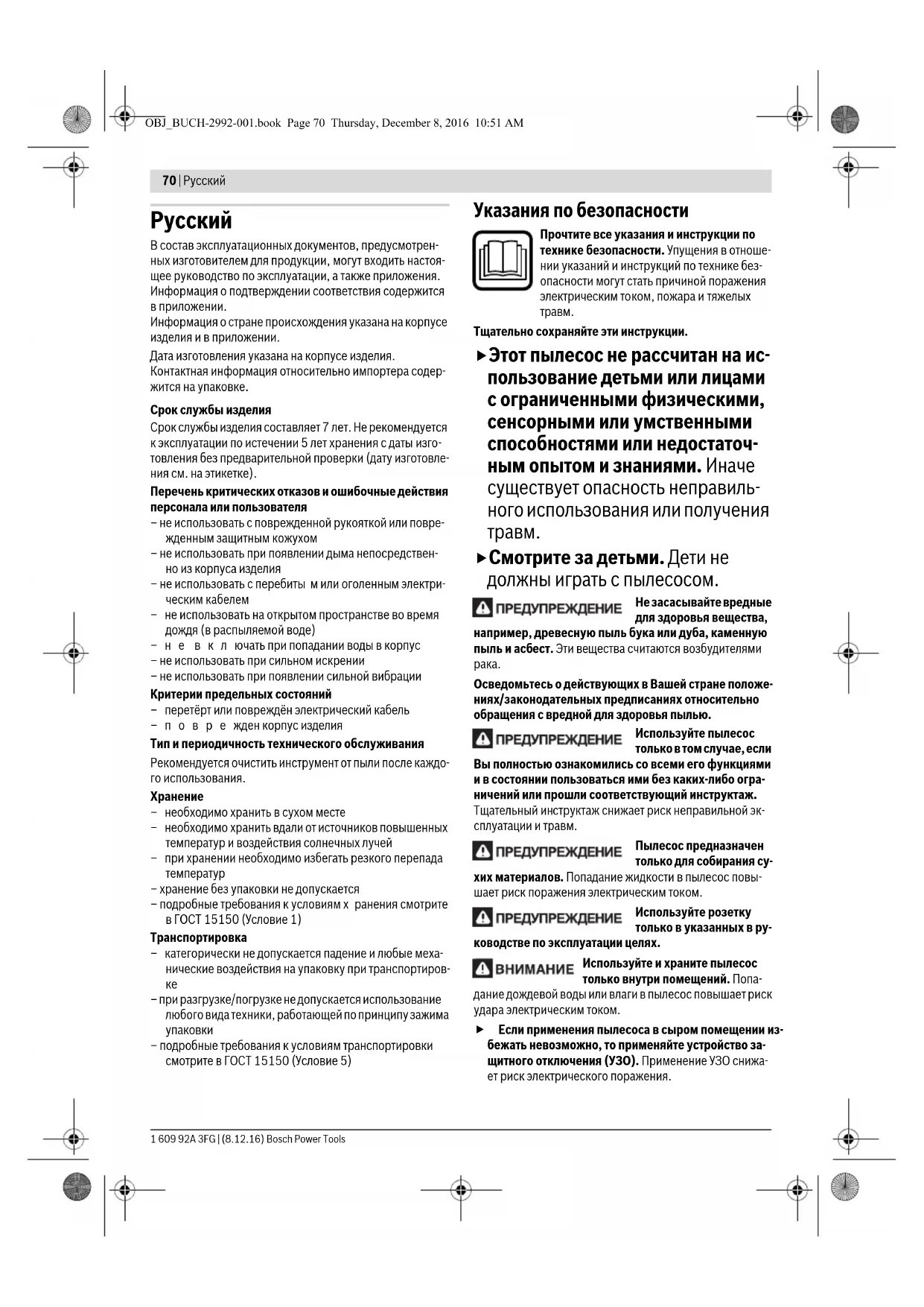 Осведомьтесь о действующих в Вашей стране положе- ниях/законодательных предписаниях относительно обращения с вредной для здоровья пылью. Используйте пылесос только в том случае, если Вы полностью ознакомились со всеми его функциями и в состоянии пользоваться ими без каких-либо огра- ничений или прошли соответствующий инструктаж. Тщательный инструктаж снижает риск неправильной эк- сплуатации и травм. Пылесос предназначен только для собирания су- хих материалов. Попадание жидкости в пылесос повы- шает риск поражения электрическим током. Используйте розетку только в указанных в ру- ководстве по эксплуатации целях. Используйте и храните пылесос только внутри помещений. Попа- дание дождевой воды или влаги в пылесос повышает риск удара электрическим током. Если применения пылесоса в сыром помещении из- бежать невозможно, то применяйте устройство за- щитного отключения (УЗО). Применение УЗО снижа- ет риск электрического поражения. OBJ_BUCH-2992-001.book Page 70 Thursday, December 8, 2016 10:51 AMРусский | 71 Bosch Power Tools 1 609 92A 3FG | (8.12.16) Подключайте пылесос к заземленной согласно предписаниям электросети. Штепсельная розетка и кабель-удлинитель должны иметь работоспособный за- щитный провод. Каждый раз перед началом работы проверяйте пы- лесос, шнур питания и штепсель. Не пользуйтесь пылесосом, если Вы обнаружили повреждения. Не открывайте пылесос самостоятельно, его ремонт разрешается выполнять только квалифицированно- му персоналу и только с использованием ориги- нальных запчастей. Поврежденные пылесосы, шнуры питания и штепсели повышают риск поражения элек- трическим током. Вынимайте вилку из розетки, прежде чем прово- дить обслуживание, чистку или настройку пылесо- са, а также перед заменой принадлежностей или от- кладыванием пылесоса в сторону. Эта мера предо- сторожности предотвращает непреднамеренное вклю- чение пылесоса. Обеспечивайте хорошую вентиляцию на рабочем