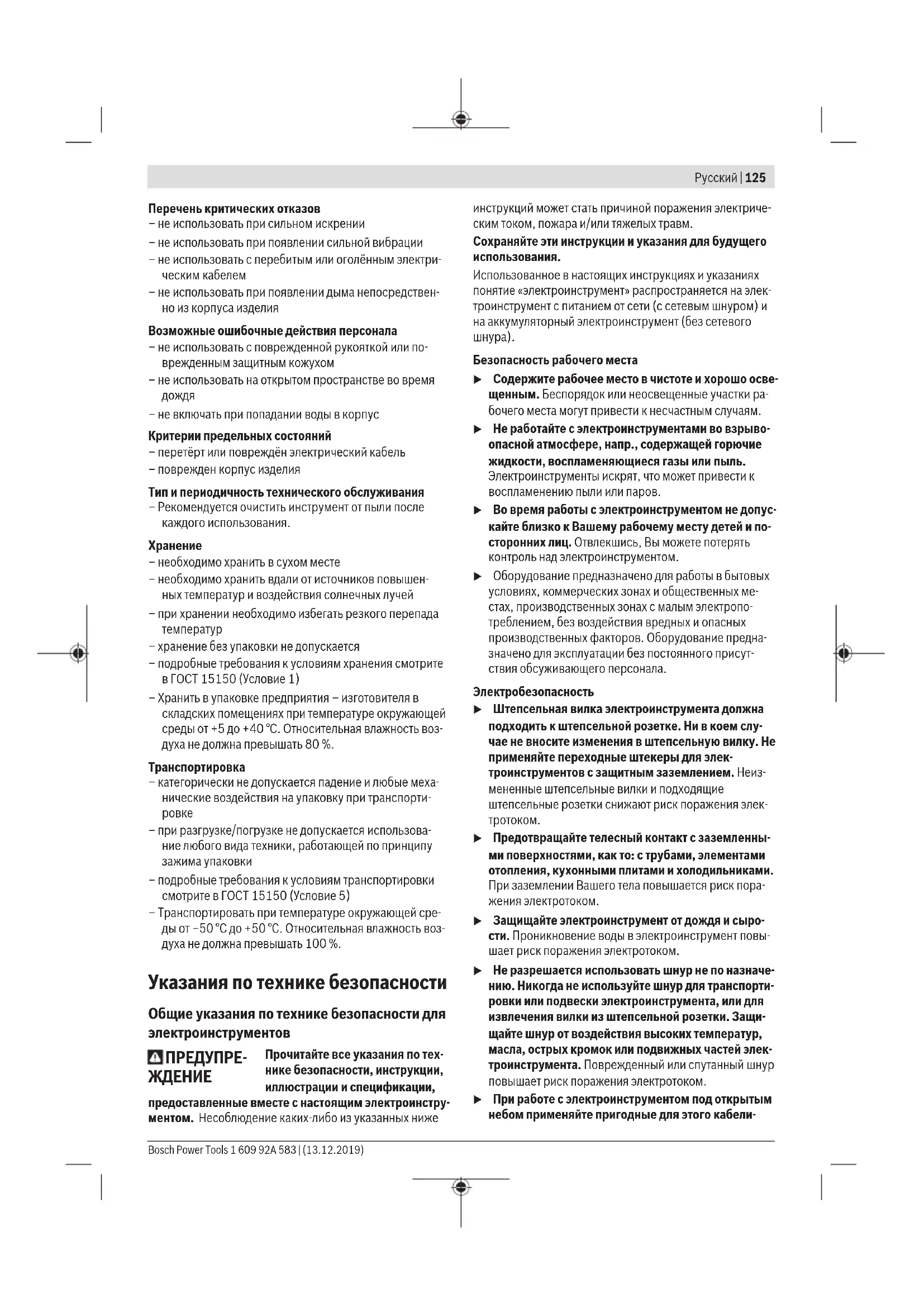 Toлько для стран Евразийского экономического союза (Таможенного союза) В состав эксплуатационных документов, предусмотрен- ных изготовителем для продукции, могут входить настоя- щее руководство по эксплуатации, а также приложения. Информация о подтверждении соответствия содержится в приложении. Информация о стране происхождения указана на корпу- се изделия и в приложении. Дата изготовления указана на последней странице об- ложки Руководства. Контактная информация относительно импортера содер- жится на упаковке. Срок службы изделия Срок службы изделия составляет 7 лет. Не рекомендует- ся к эксплуатации по истечении 5 лет хранения с даты изготовления без предварительной проверки (дату изго- товления см. на этикетке). Указанный срок службы действителен при соблюдении потребителем требований настоящего руководства. 1 609 92A 583 | (13.12.2019) Bosch Power ToolsРусский | 125 Перечень критических отказов – не использовать при сильном искрении – не использовать при появлении сильной вибрации – не использовать с перебитым или оголённым электри- ческим кабелем – не использовать при появлении дыма непосредствен- но из корпуса изделия Возможные ошибочные действия персонала – не использовать с поврежденной рукояткой или по- врежденным защитным кожухом – не использовать на открытом пространстве во время