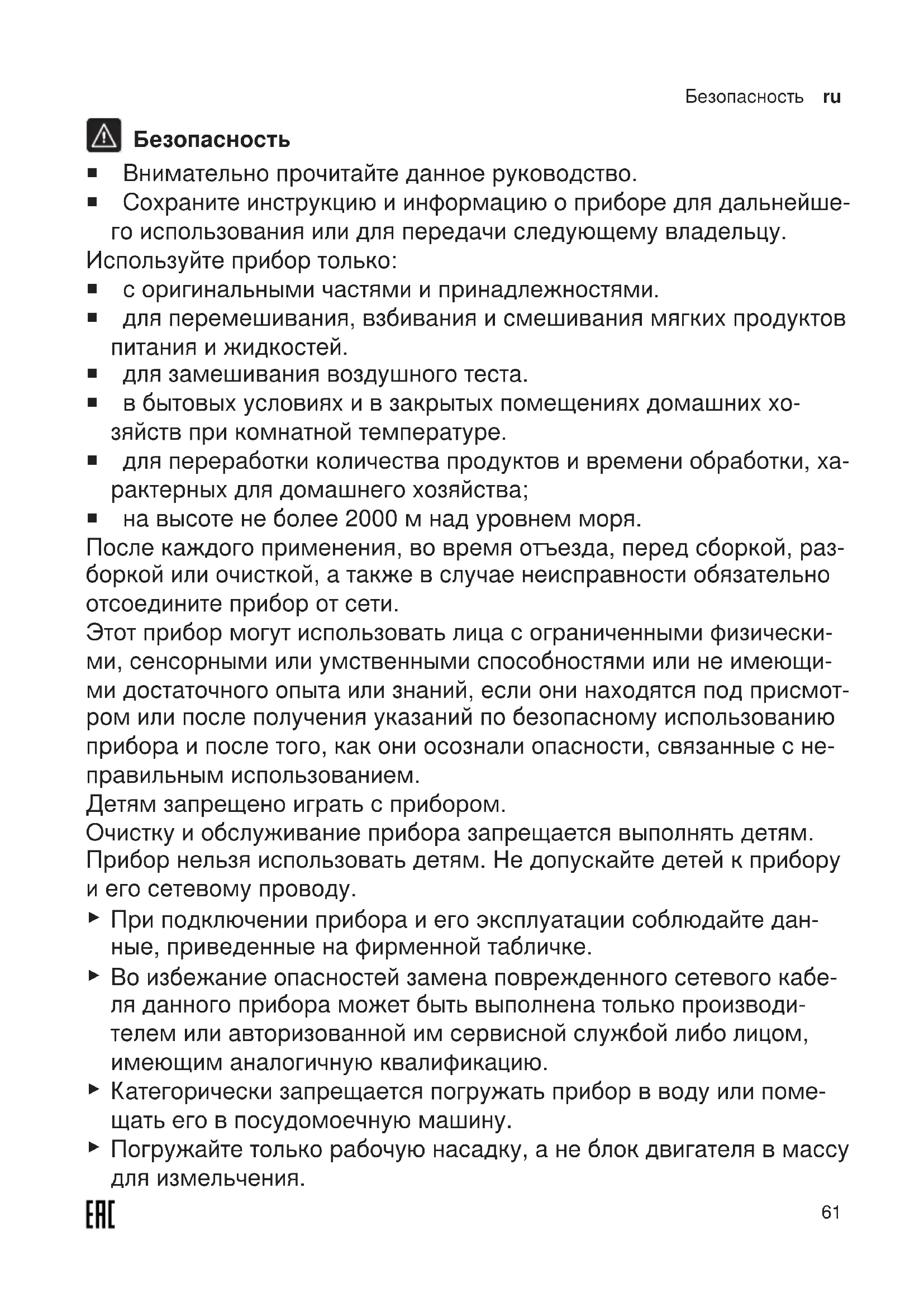 Безопасность ¡ Внимательно прочитайте данное руководство. ¡ Сохраните инструкцию и информацию о приборе для дальнейше- го использования или для передачи следующему владельцу. Используйте прибор только: ¡ с оригинальными частями и принадлежностями. ¡ для перемешивания, взбивания и смешивания мягких продуктов питания и жидкостей. ¡ для замешивания воздушного теста. ¡ в бытовых условиях и в закрытых помещениях домашних хо- зяйств при комнатной температуре. ¡ для переработки количества продуктов и времени обработки, ха- рактерных для домашнего хозяйства; ¡ на высоте не более 2000м над уровнем моря. После каждого применения, во время отъезда, перед сборкой, раз- боркой или очисткой, а также в случае неисправности обязательно отсоедините прибор от сети. Этот прибор могут использовать лица с ограниченными физически- ми, сенсорными или умственными способностями или не имеющи- ми достаточного опыта или знаний, если они находятся под присмот- ром или после получения указаний по безопасному использованию прибора и после того, как они осознали опасности, связанные с не- правильным использованием. Детям запрещено играть с прибором. Очистку и обслуживание прибора запрещается выполнять детям. Прибор нельзя использовать детям. Не допускайте детей к прибору и его сетевому проводу.