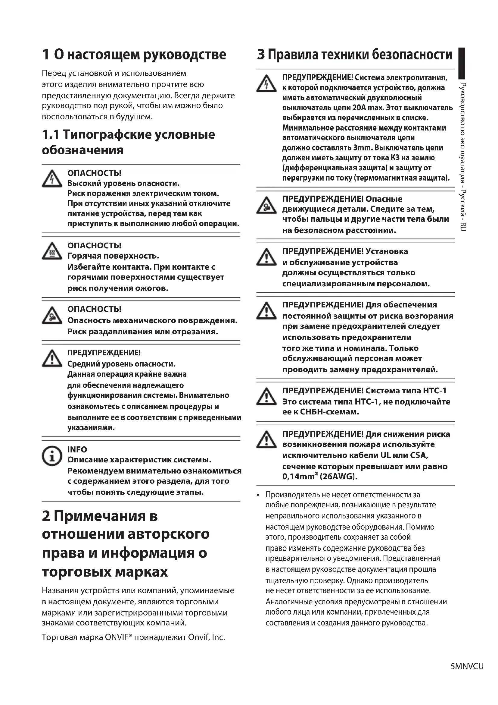 Опасность механического повреждения. Риск раздавливания или отрезания. ПРЕДУПРЕЖДЕНИЕ! Средний уровень опасности. Данная операция крайне важна для обеспечения надлежащего функционирования системы. Внимательно ознакомьтесь с описанием процедуры и выполните ее в соответствии с приведенными указаниями. INFO Описание характеристик системы. Рекомендуем внимательно ознакомиться с содержанием этого раздела, для того чтобы понять следующие этапы. 2 Примечания в отношении авторского права и информация о торговых марках Названия устройств или компаний, упоминаемые в настоящем документе, являются торговыми марками или зарегистрированными торговыми знаками соответствующих компаний. Торговая марка ONVIF® принадлежит Onvif, Inc.