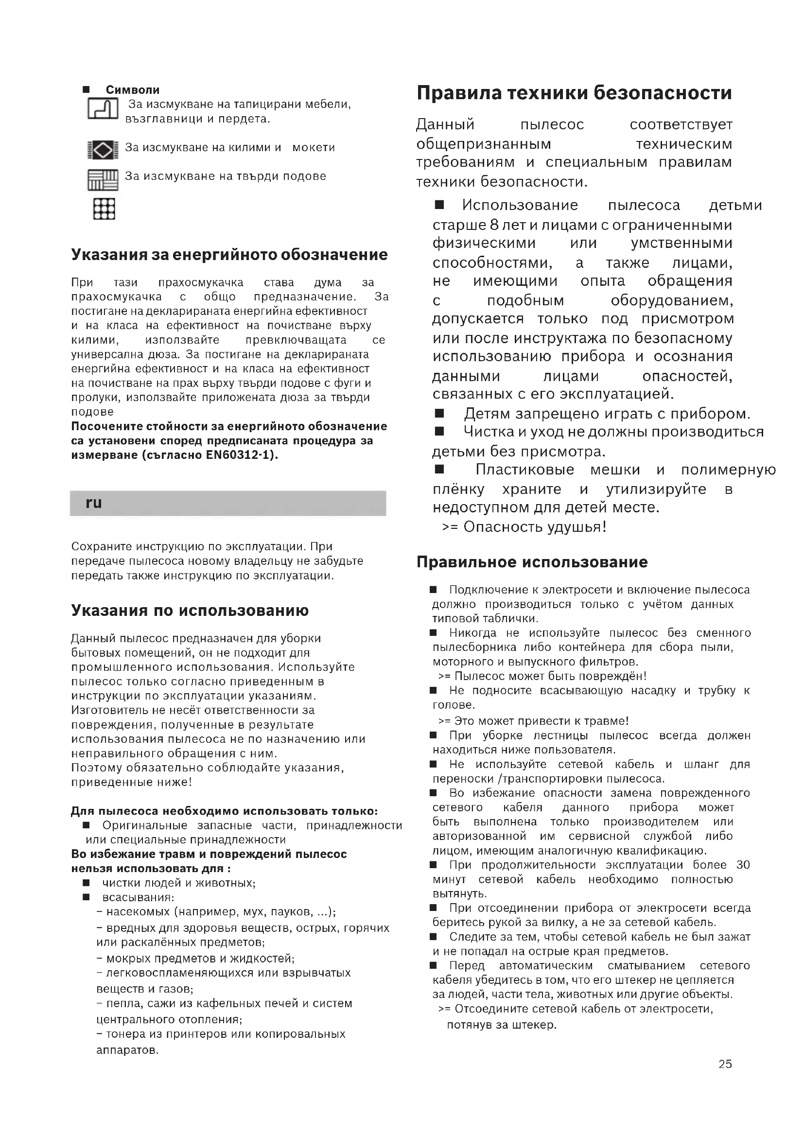 Посочените стойности за енергийното обозначение са установени според предписаната процедура за измерване (съгласно EN60312-1). Правила техники безопасности Данный пылесос соответствует общепризнанным техническим требованиям и специальным правилам техники безопасности.