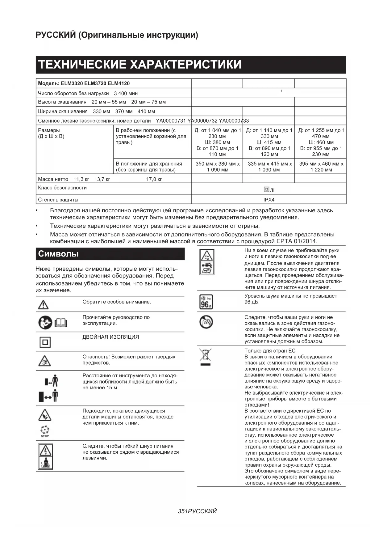 Газонокосилкапредназначенадлястрижкигазонов. Запрещаетсяиспользоватьеедлядругихцелей. Использованиемашинынепоназначениюможет привестикопаснымситуациям. Источник питания Данныйинструментдолженподключатьсякисточ- никупитанияснапряжением,соответствующим напряжению,указанномунаидентификационной пластине,иможетработатьтолькоотоднофазного источникапеременноготока.Онимеетдвойную изоляциюипоэтомуможетподключатьсякрозеткам беззаземления. Воизбежаниеугрозыбезопасности,вслучае поврежденияшнурапитанияегонеобходимо заменитьвмастерскойизготовителя. Для низковольтных систем общего пользования напряжением от 220 до 250 В. Включениеэлектрическогоустройстваприводитк колебаниямнапряжения.Использованиеданного устройствавнеблагоприятныхусловияхэлектро- снабженияможетоказыватьнегативноевлияниена работудругогооборудования.Еслиполноесопро- тивлениевсетипитаниянепревышает0,425Ом (дляELM3720)или0,427Ом(дляELM4120),можно исходитьизтого,чтоинструментнебудетоказывать негативноговлияния.Сетеваярозетка,используе- маядляданногоинструмента,должнабытьзащи- щенапредохранителемилипрерывателемцепис медленнымразмыканием.