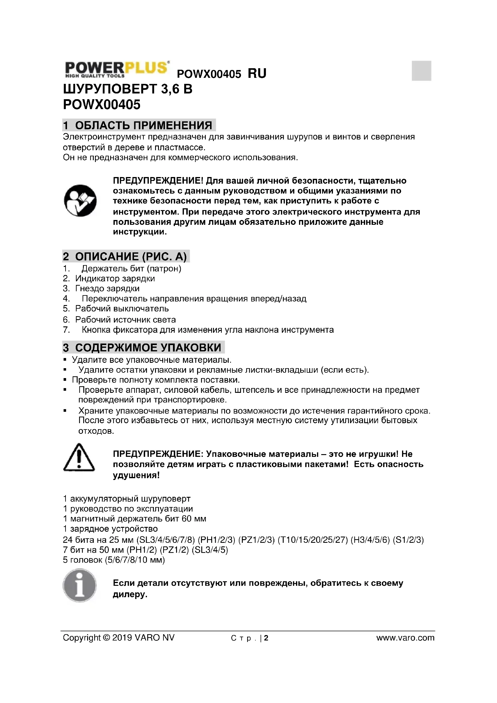 - 13 ДЕКЛАРАЦИЯ О СООТВЕТСТВИИ POWX00405 RU Copyright © 2019 VARO NV С т р . | 2 www.varo.com ШУРУПОВЕРТ 3,6 В POWX00405 1 ОБЛАСТЬ ПРИМЕНЕНИЯ Электроинструмент предназначен для завинчивания шурупов и винтов и сверления отверстий в дереве и пластмассе. Он не предназначен для коммерческого использования. ПРЕДУПРЕЖДЕНИЕ! Для вашей личной безопасности, тщательно ознакомьтесь с данным руководством и общими указаниями по технике безопасности перед тем, как приступить к работе с инструментом. При передаче этого электрического инструмента для пользования другим лицам обязательно приложите данные инструкции. 2 ОПИСАНИЕ (РИС. A) p. 10