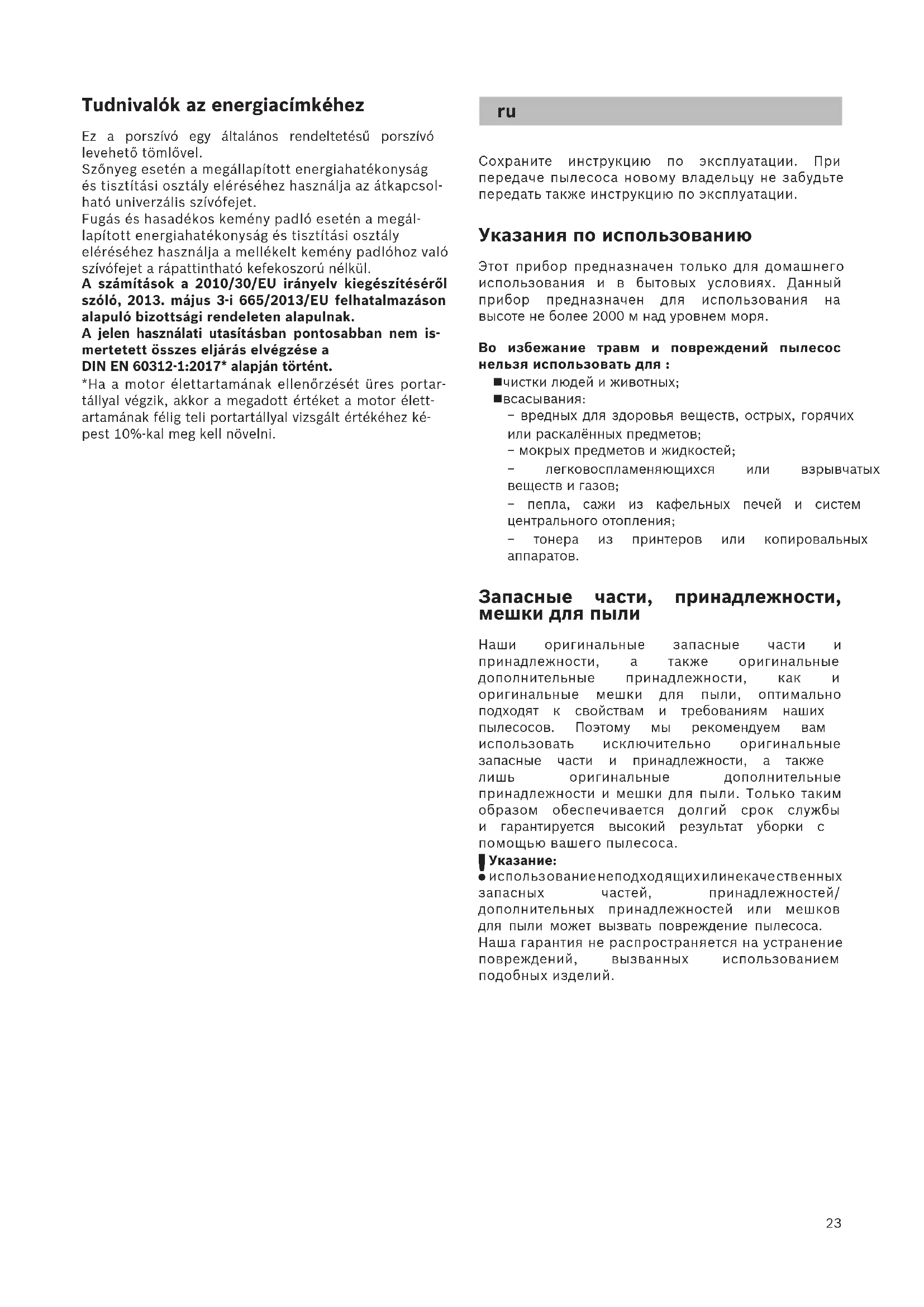 Сохраните инструкцию по эксплуатации. При передаче пылесоса новому владельцу не забудьте передать также инструкцию по эксплуатации.