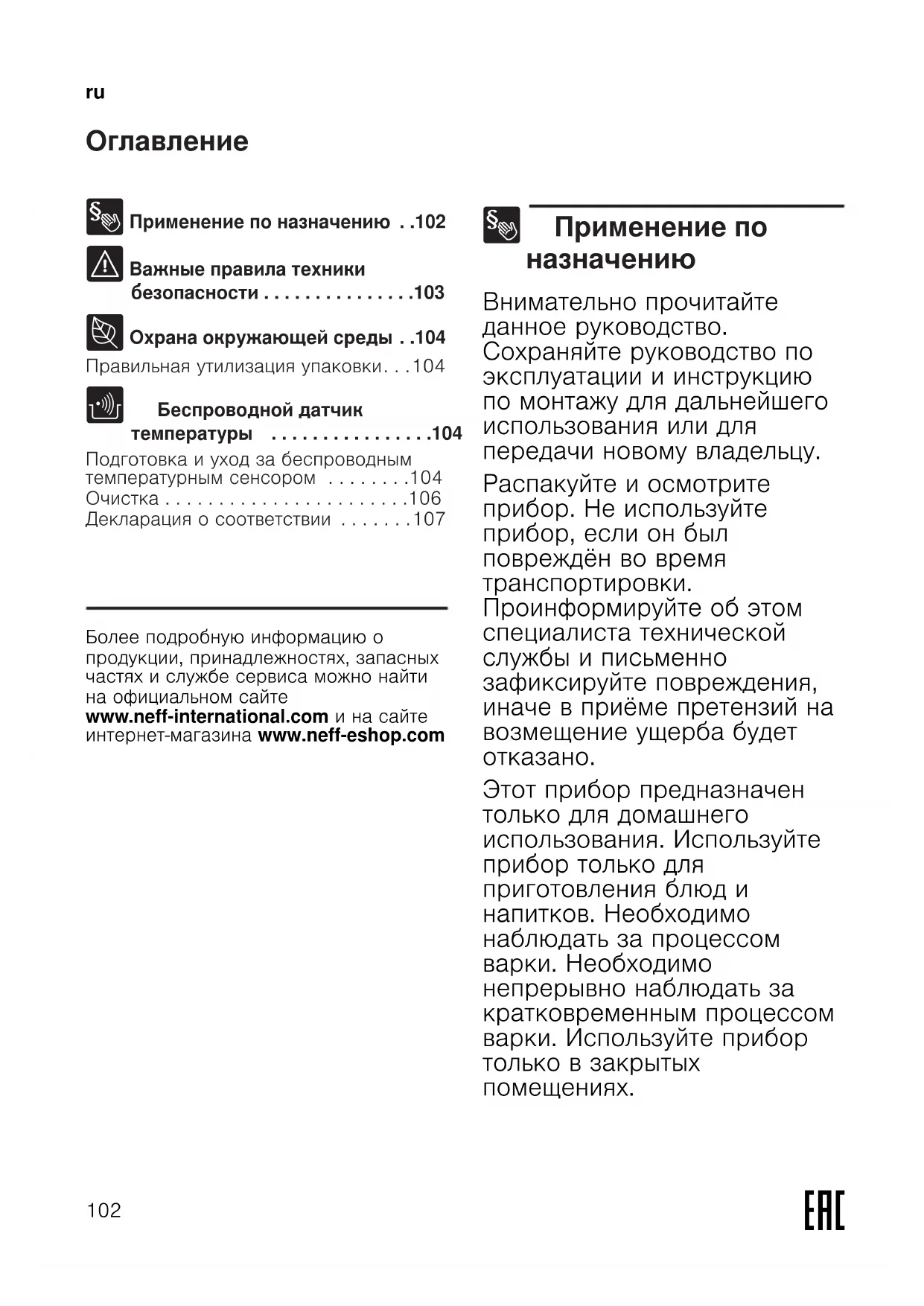 - Декларация о соответствии Produktinfo Более подробную информацию о продукции, принадлежностях, запасных частях и службе сервиса можно найти на официальном сайте www.neff-international.com и на сайте интернет-магазина www.neff-eshop.com 8 Применение по p. 107