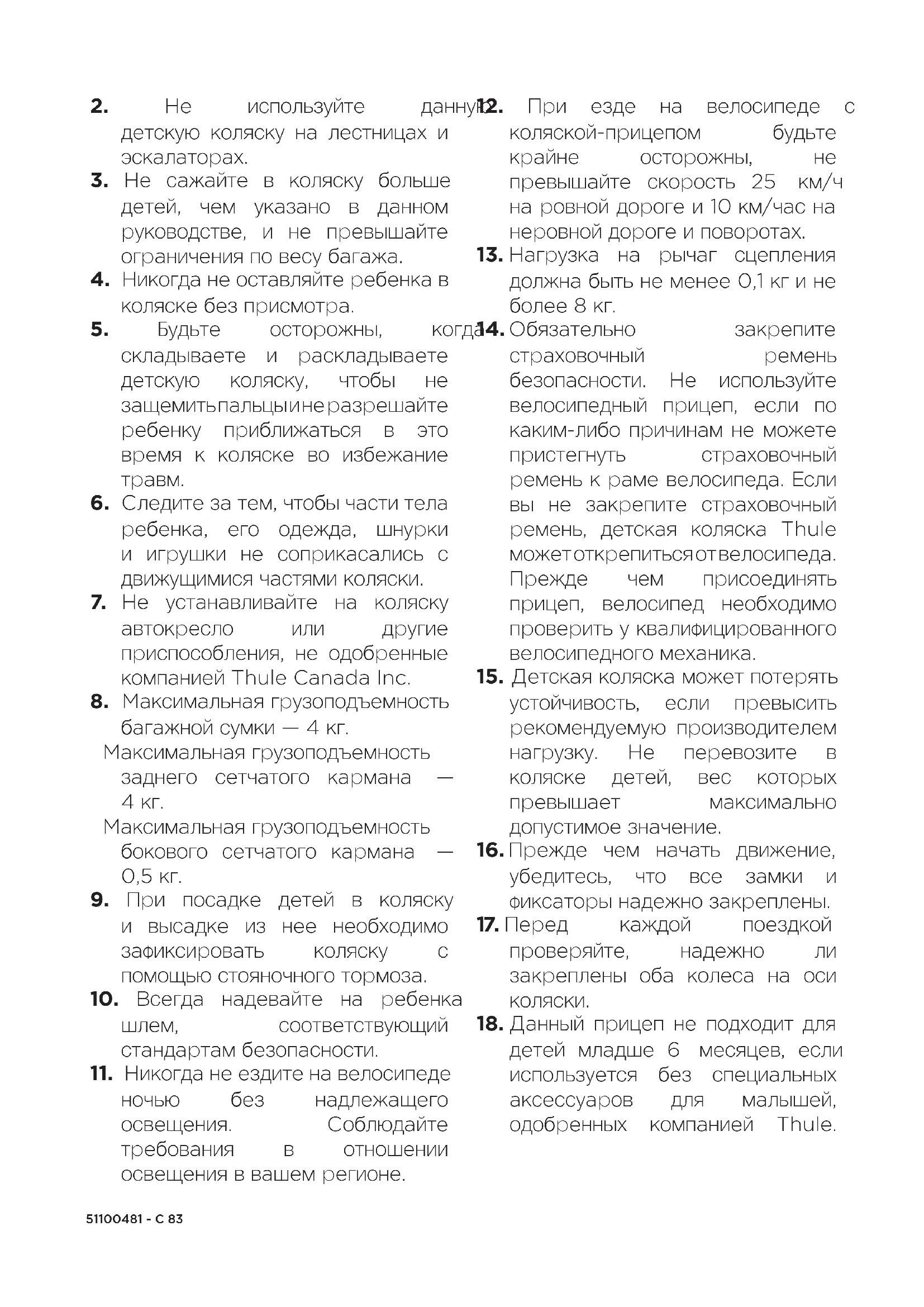 - Перед использованием этого продукта внимательно прочтите настоящее руководство по эксплуатации и ознакомьтесь с правилами техники безопасности.• Кроме этого, необходимо ознакомиться с действующими в вашей стране правилами эксплуатации данного продукта.• Если коляска используется как велосипедный прицеп с аксессуарами Thule из комплекта, следуйте руководству по эксплуатации велосипеда, который используется в качестве буксира, и придерживайтесь установленных требований к максимально допустимой нагрузке на велосипед.• Данная коляска предназначена для прогулок с детьми в светлое время суток по тротуарам, дорогам общего пользования с неинтенсивным движением и по ровным дорожкам.• В условиях плохого освещения рекомендуется использовать световой индикатор.Не рекомендуется:• перевозить детей вместе с животными;• использовать коляску для езды по бездорожью;• превышать максимально допустимый вес;• превышать скорость;• модифицировать коляску каким-либо образом.Производитель не несет ответственности за повреждения, возникшие в результате действий, не предусмотренных настоящим руководством по эксплуатации.Дополнительные сведения см. на странице www.thule.com/warranty.