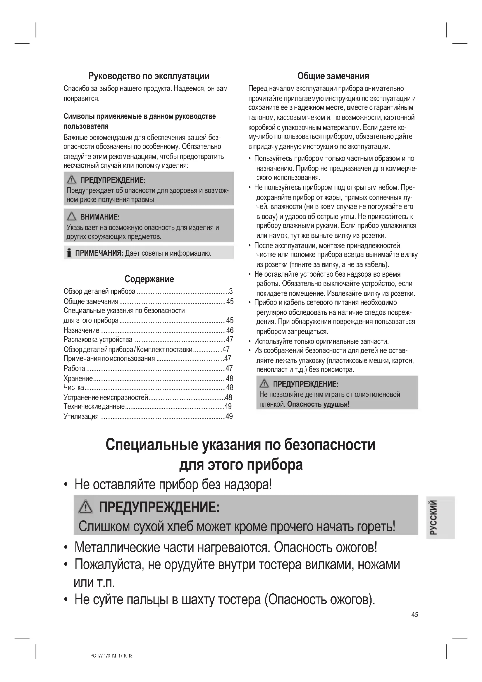 Данное устройство предназначено для подрумянивания ломтиков хлеба и булочек с помощью приспособления для обжаривания. Устройство предназначено для домашнего исполь- зования. Его можно использовать только способом, описанным в данном руководстве. Устройство нельзя использовать для коммерческих целей. Любое другое использование считается использо- ванием не по назначению и может привести к порче имущества или даже к травме. Производитель не несет ответственности за возможный ущерб, который может быть причинен в результате неправильного использования устройства.PC-TA1170_IM 17.10.18