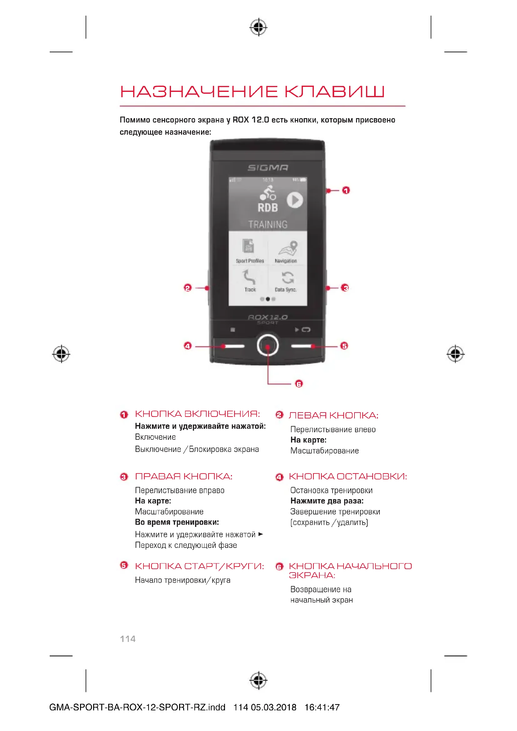SIGMA-SPORT-BA-ROX-12-SPORT-RZ.indd 113 05.03.2018 16:41:47114 НАЗНАЧЕНИЕ КЛАВИШ Помимо сенсорного экрана у ROX 12.0 есть кнопки, которым присвоено следующее назначение: