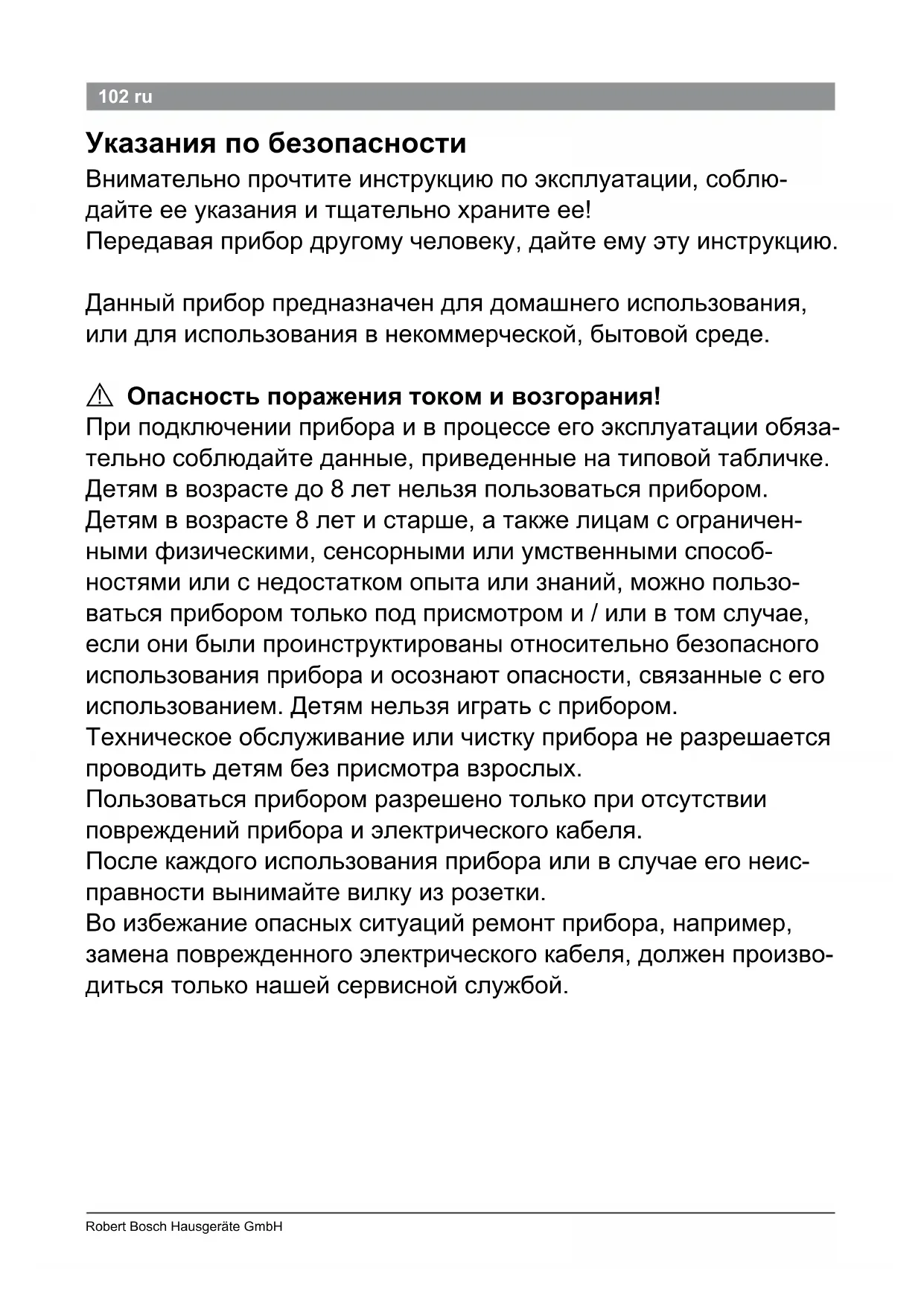 (напруга / частота) 100 – 240 В 50 / 60 Гц Потужність нагрівання 37 Вт A102 Robert Bosch Hausgeräte GmbH 102 ru Указания по безопасности Внимательно прочтите инструкцию по эксплуатации, соблю- дайте ее указания и тщательно храните ее! Передавая прибор другому человеку, дайте ему эту инструкцию. Данный прибор предназначен для домашнего использования, или для использования в некоммерческой, бытовой среде.