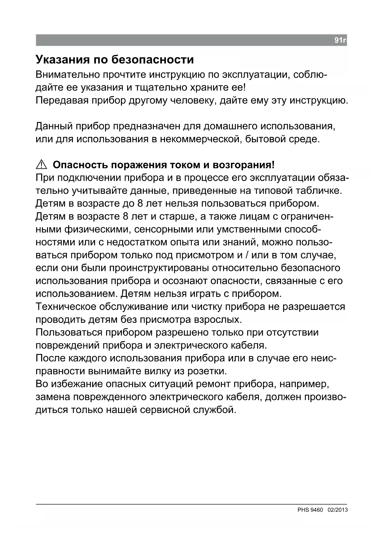 (напруга / частота) 220 – 240 В 50 / 60 Гц Потужність нагрівання 31 Вт A91 PHS 9460 02/2013 91ru Указания по безопасности Внимательно прочтите инструкцию по эксплуатации, соблю- дайте ее указания и тщательно храните ее! Передавая прибор другому человеку, дайте ему эту инструкцию. Данный прибор предназначен для домашнего использования, или для использования в некоммерческой, бытовой среде.