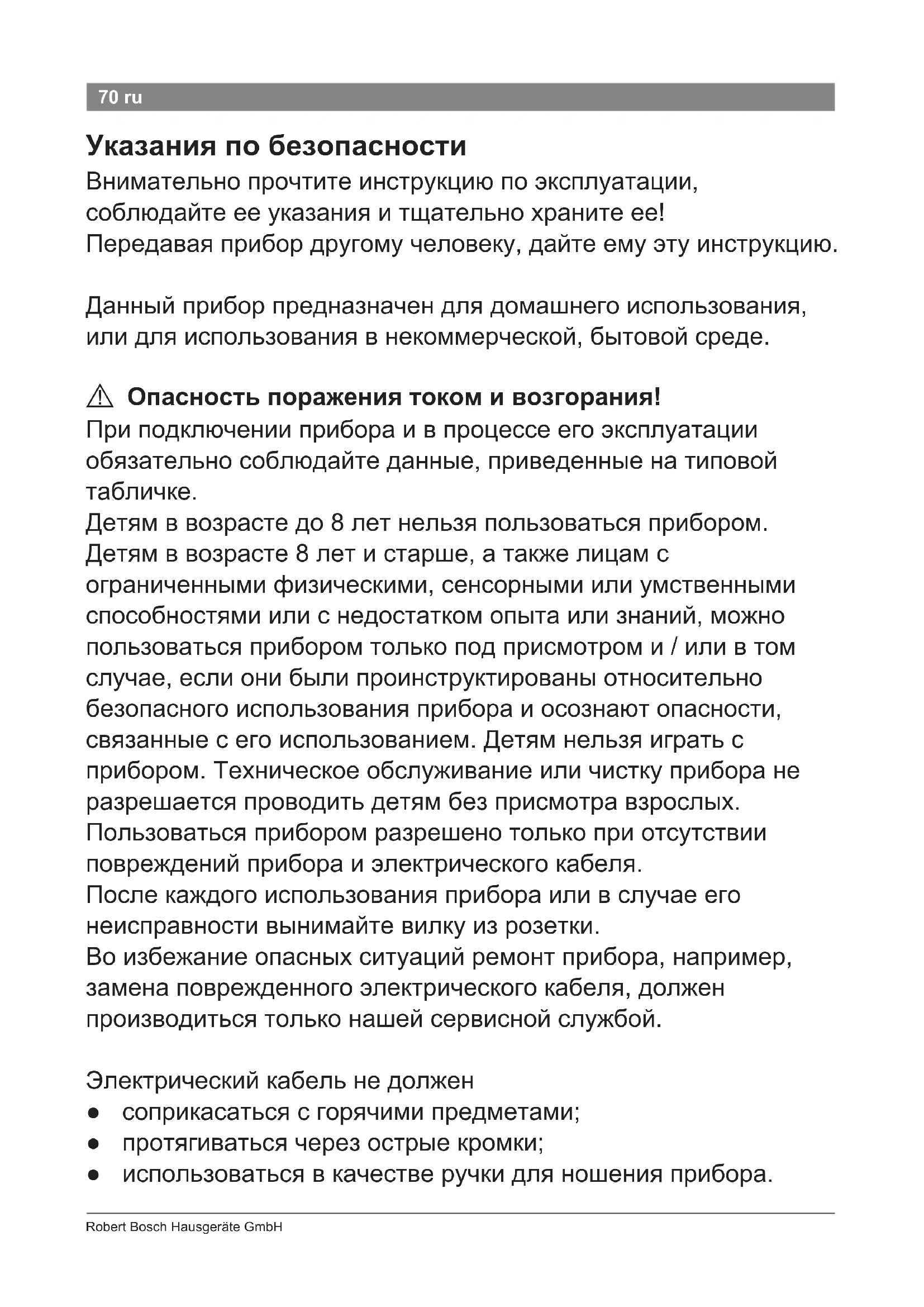 Технічні дані Підключеннядоживлення (напруга/частота) 220-240В 50Гц Потужність 700Вт70 RobertBoschHausgeräteGmbH 70 ru Указания по безопасности Внимательнопрочтитеинструкциюпоэксплуатации, соблюдайтеееуказанияитщательнохранитеее! Передаваяприбордругомучеловеку,дайтеемуэтуинструкцию. Данныйприборпредназначендлядомашнегоиспользования, илидляиспользованиявнекоммерческой,бытовойсреде.