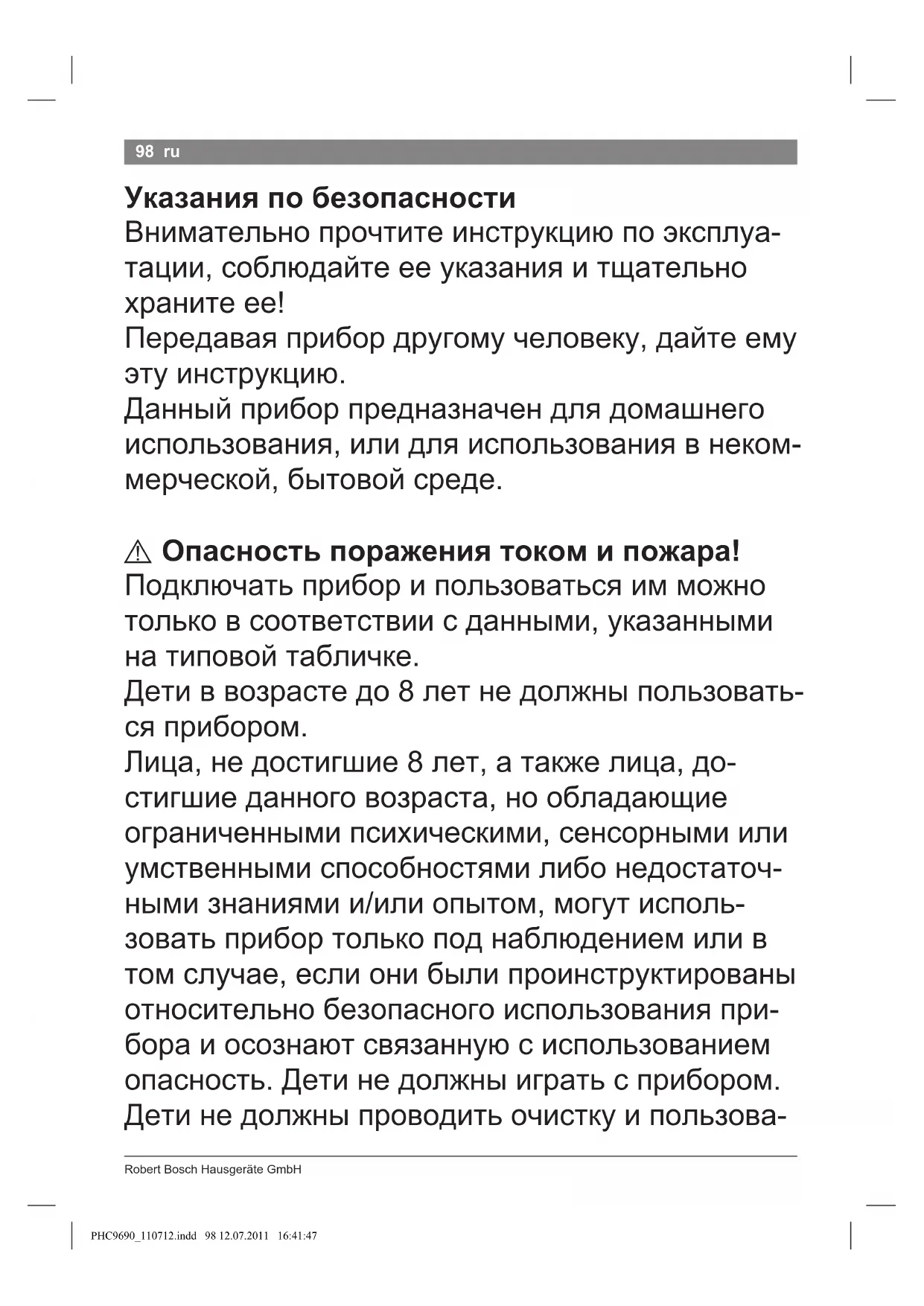 PHC9690_110712.indd 97 12.07.2011 16:41:47RobertBoschHausgeräteGmbH 98 ru Указанияпобезопасности Внимательнопрочтитеинструкциюпоэксплуа- тации,соблюдайтеееуказанияитщательно