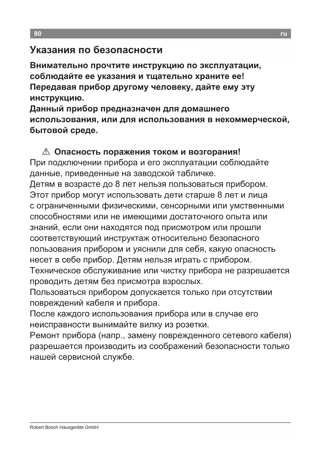 Не пользуйтесь прибором рядом с водой, налитой в ванну, раковину или иные емкости. A Опасность для жизни! Ни в коем случае не допускайте контакта прибора с водой. Опасность сохраняется, даже если прибор выключен, поэтому после пользования прибором и в случае перерывов при пользовании им необходимо вынимать вилку из розетки. Дополнительную защиту обеспечивает встраивание автомата защитного отключения до 30 мA в электропроводку здания. Посоветуйтесь со специалистом-электромонтажником. A Опасность удушения! Не разрешайте детям играть с упаковочным материалом. A Опасность ожогов! Насадка-концентратор и насадка-диффузор могут нагреваться. Перед отсоединением дайте им остыть.82 Robert Bosch Hausgeräte GmbH