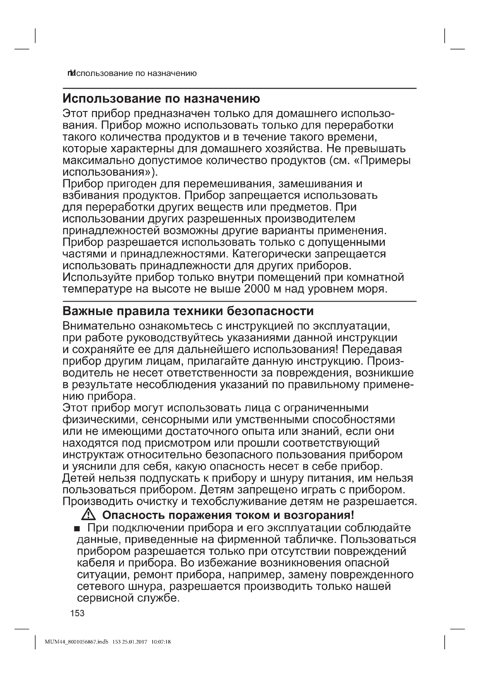Использование по назначению Использование по назначению Этот прибор предназначен только для домашнего использо вания. Прибор можно использовать только для переработки такого количества продуктов и в течение такого времени, которые характерны для домашнего хозяйства. Не превышать максимально допустимое количество продуктов (см. «Примеры использования»). Прибор пригоден для перемешивания, замешивания и взбивания продуктов. Прибор запрещается использовать для переработки других веществ или предметов. При использовании других разрешенных производителем принадлежностей возможны другие варианты применения. Прибор разрешается использовать только с допущенными частями и принадлежностями. Категорически запрещается использовать принадлежности для других приборов. Используйте прибор только внутри помещений при комнатной температуре на высоте не выше 2000 м над уровнем моря. Важные правила техники безопасности Внимательно ознакомьтесь с инструкцией по эксплуатации, при работе руководствуйтесь указаниями данной инструкции и сохраняйте ее для дальнейшего использования! Передавая прибор другим лицам, прилагайте данную инструкцию. Произ водитель не несет ответственности за повреждения, возникшие в результате несоблюдения указаний по правильному примене нию прибора. Этот прибор могут использовать лица с ограниченными физическими, сенсорными или умственными способностями или не имеющими достаточного опыта или знаний, если они находятся под присмотром или прошли соответствующий инструктаж относительно безопасного пользования прибором и уяснили для себя, какую опасность несет в себе прибор. Детей нельзя подпускать к прибору и шнуру питания, им нельзя пользоваться прибором. Детям запрещено играть с прибором. Производить очистку и техобслуживание детям не разрешается. W Опасность поражения током и возгорания! ■ При подключении прибора и его эксплуатации соблюдайте данные, приведенные на фирменной табличке. Пользоваться прибором разрешается только при отсутствии повреждений кабеля и прибора. Во избежание возникновения опасной ситуации, ремонт прибора, например, замену поврежденного сетевого шнура, разрешается производить только нашей сервисной службе. MUM44_8001056867.indb 153 25.01.2017 10:07:18154