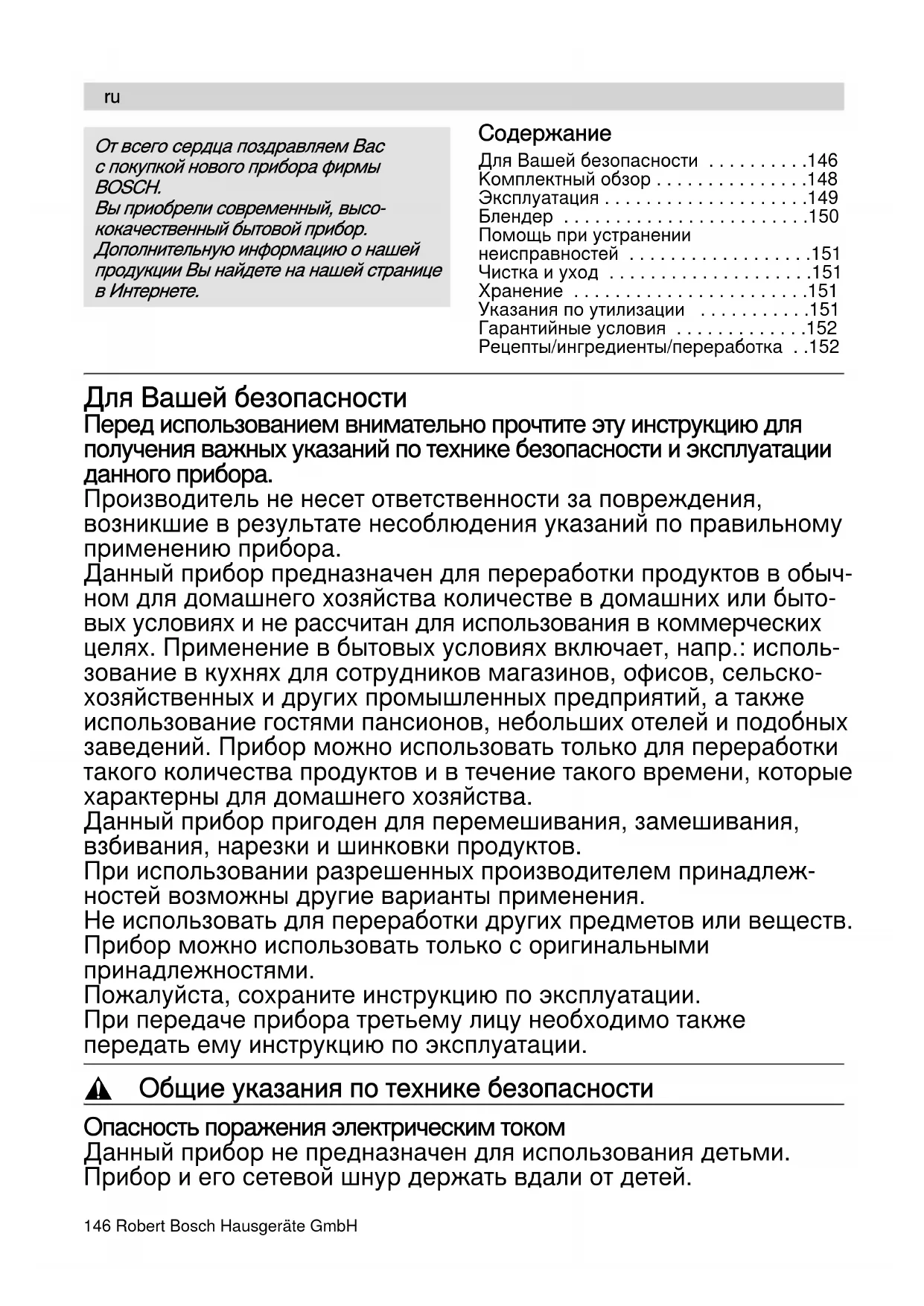 От всего сердца поздравляем Вас с покупкой нового прибора фирмы BОSСH.Вы приобрели современный, высо-кокачественный бытовой прибор. Дополнительную информацию о нашей продукции Вы найдете на нашей странице в Интернете.Robert Bosch Hausgeräte GmbH 147 Лица с ограниченными физическими, сенсорными или умствен- ными способностями или с недостатком опыта и знаний могут пользоваться приборами только под присмотром или если они получили указания по безопасному использованию прибора и осознали опасности, связанные с неправильным использо- ванием. Детям нельзя играть с прибором. Подключать и использовать прибор можно только в соответствии с техническими данными на типовой табличке. Использовать только в том случае, если у прибора и его сетевого шнура нет никаких повреждений. Прибор следует всегда отсоеди- нять от сети, когда он остается без присмотра, а также перед его сборкой, разборкой или чисткой. Перед заменой принадлежностей или дополнительных деталей, которые во время работы приводятся в движение, прибор должен быть отключен и отсоединен от сети. Не протягивать сетевой шнур через острые края или горячие поверхности. Если сетевой шнур данного прибора будет повреж- ден, то, во избежание опасных ситуаций, его должен будет заменить производитель, или его сервисная служба, или лицо с аналогичной квалификацией. Ремонт прибора поручать только нашей сервисной службе. , Указания по технике безопасности для данного прибора Опасность травмирования Опасность поражения электрическим током При перебоях электроснабжения прибор остается включенным и после возобновления электроснабжения снова начинает работать. Принадлежности и насадки можно заменять только после остановки привода (поворотный переключатель на «0/оff») и извлечения вилки из розетки. Основной блок никогда не погру- жать в жидкости, никогда не держать под проточной водой и не мыть в посудомоечной машине. Перед устранением неисправности извлечь вилку из розетки. Опасность травмирования вращающимися насадками! Во время эксплуатации никогда не опускать руки в смесительную чашу (привод движется еще некоторое время после выключе- ния). Hасадки можно менять только после остановки привода. Работать можно только с установленной защитной крышкой для привода (привод блендера). Опасность травмирования об острые ножи! Ударный нож можно брать только за пластмассовую ручку (верхний конец). Диски-измельчители можно брать только за пластмассовую ручку. ru148 Robert Bosch Hausgeräte GmbH Опасность травмирования об острые ножи блендера/вращающийся