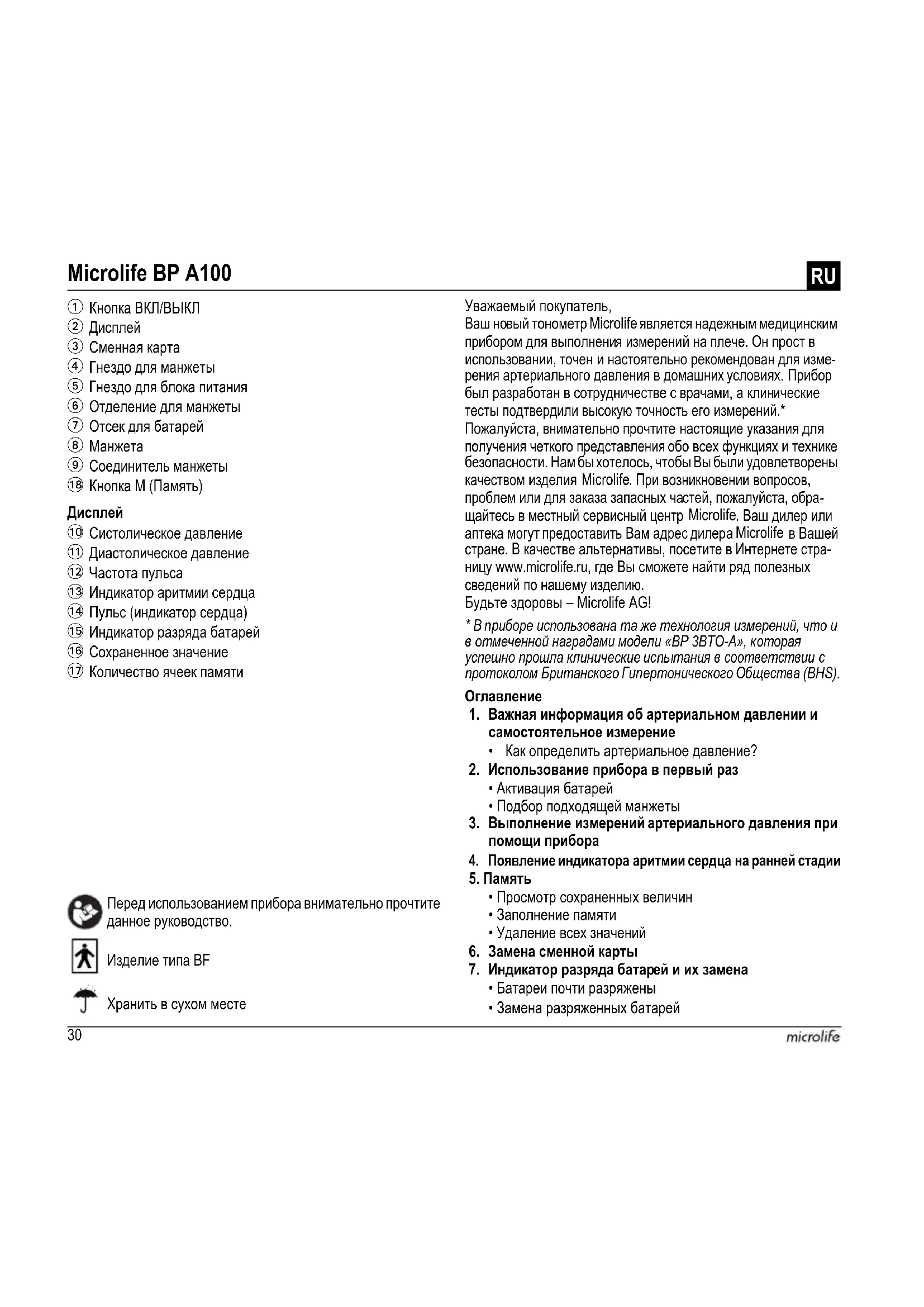 РУКОВОДСТВО ПОЛЬЗОВАТЕЛЯ BP A10030 MICROLIFE