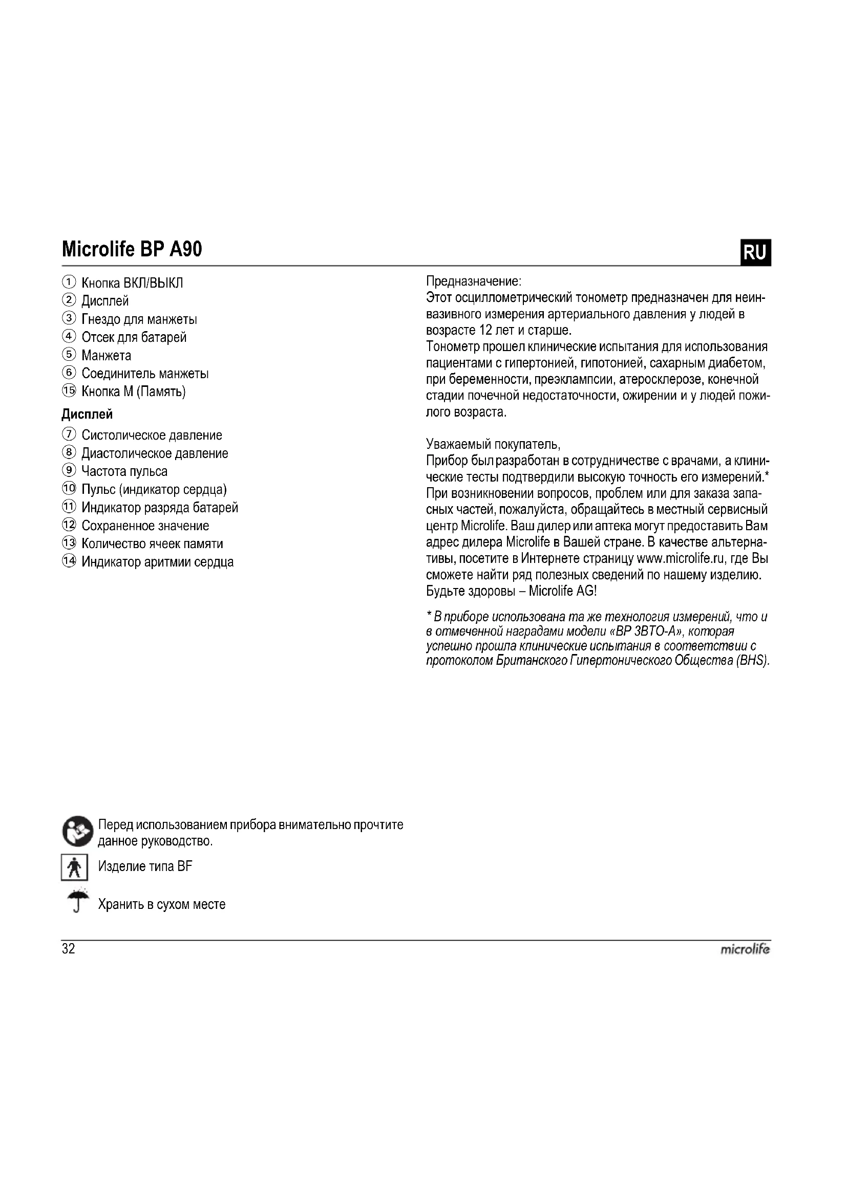 Перед использованием прибора внимательно прочтите данное руководство. Изделие типа BF Предназначение: Этот осциллометрический тонометр предназначен для неин- вазивного измерения артериального давления у людей в возрасте 12 лет и старше. Тонометр прошел клинические испытания для использования пациентами с гипертонией, гипотонией, сахарным диабетом, при беременности, преэклампсии, атеросклерозе, конечной стадии почечной недостаточности, ожирении и у людей пожи- лого возраста. Уважаемый покупатель,