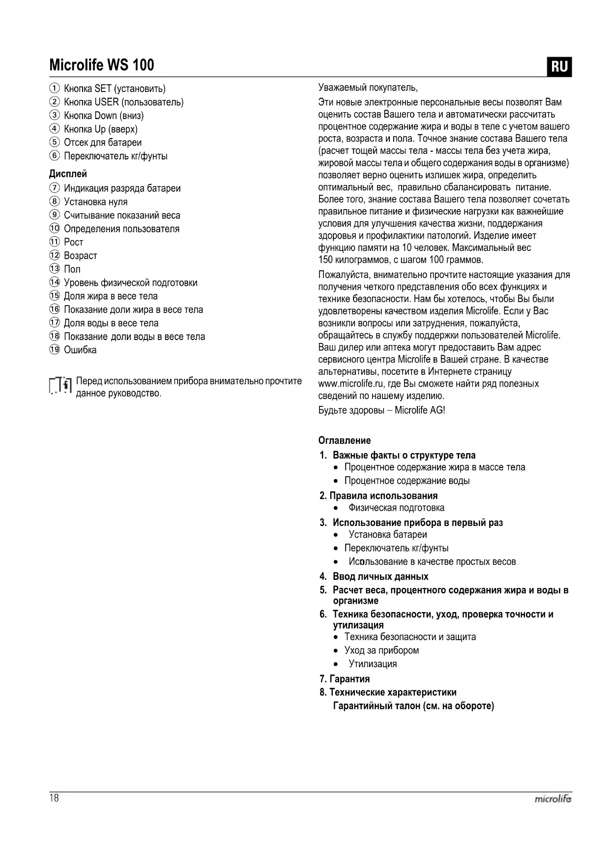 Скачайте инструкцию для вашего Весы в формате PDF бесплатно! Найдите своё руководство WS 100 - MICROLIFE и возьмите своё электронное устройство обратно в руки. На этой странице опубликованы все документы, необходимые для использования вашего устройства. WS 100 бренда MICROLIFE.