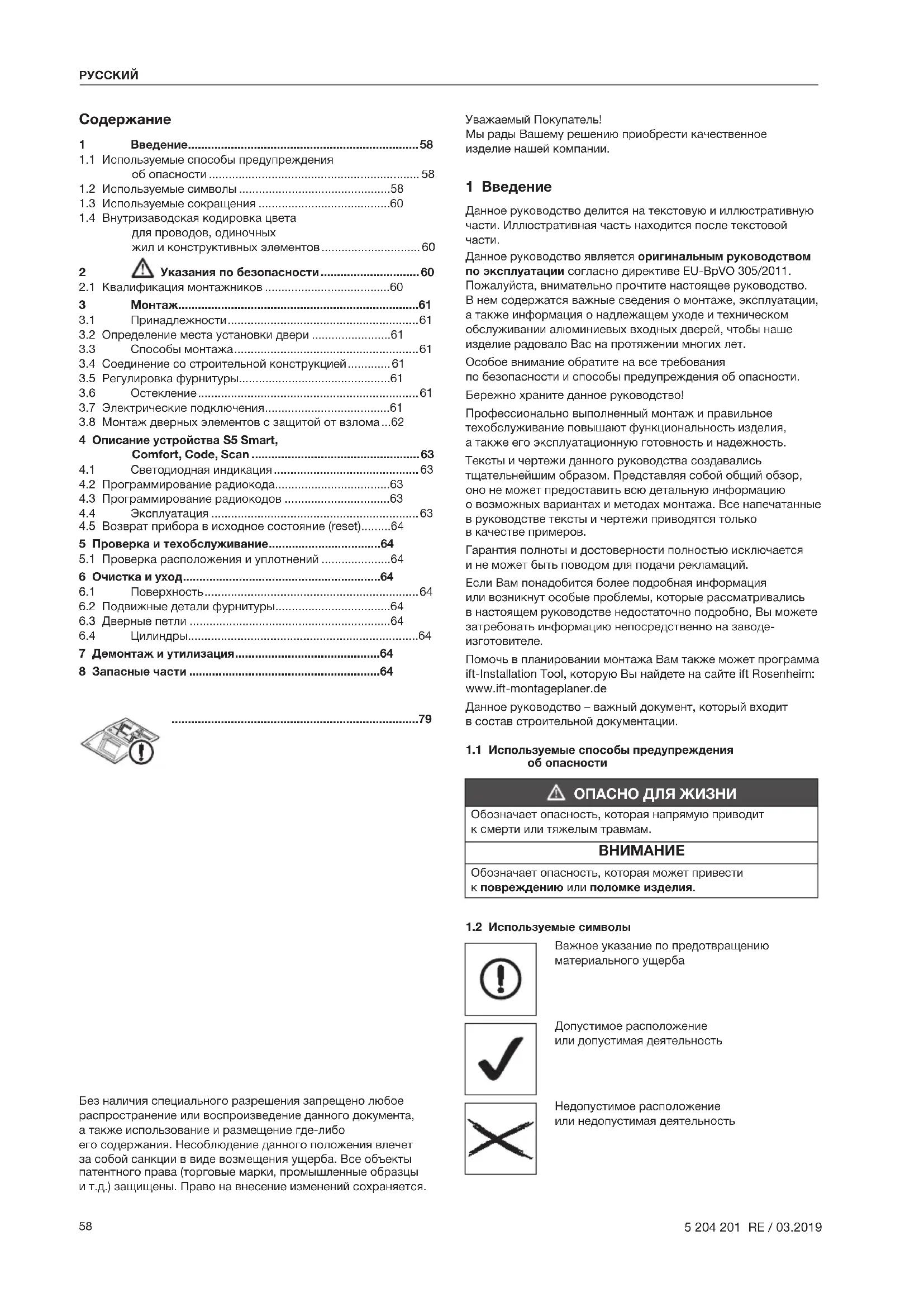 Данное руководство является оригинальным руководством по эксплуатации согласно директиве EU-BpVO 305/2011. Пожалуйста, внимательно прочтите настоящее руководство. Внем содержатся важные сведения о монтаже, эксплуатации, а также информация о надлежащем уходе и техническом обслуживании алюминиевых входных дверей, чтобы наше изделие радовало Вас на протяжении многих лет. Особое внимание обратите на все требования побезопасности и способы предупреждения об опасности. Бережнохраните данное руководство! Профессионально выполненный монтаж и правильное техобслуживание повышают функциональность изделия, атакже его эксплуатационную готовность и надежность. Тексты и чертежи данного руководства создавались тщательнейшим образом. Представляя собой общий обзор, оно не может предоставить всю детальную информацию овозможных вариантах и методах монтажа. Всенапечатанные вруководстве тексты и чертежи приводятся только вкачествепримеров. Гарантия полноты и достоверности полностью исключается ине может быть поводом для подачи рекламаций. Если Вам понадобится более подробная информация иливозникнут особые проблемы, которые рассматривались внастоящем руководстве недостаточно подробно, Выможете затребовать информацию непосредственно на заводе- изготовителе. Помочь в планировании монтажа Вам также может программа ift-Installation Tool, которую Вы найдете на сайте ift Rosenheim: www.ift-montageplaner.de Данное руководство – важный документ, который входит всостав строительной документации.