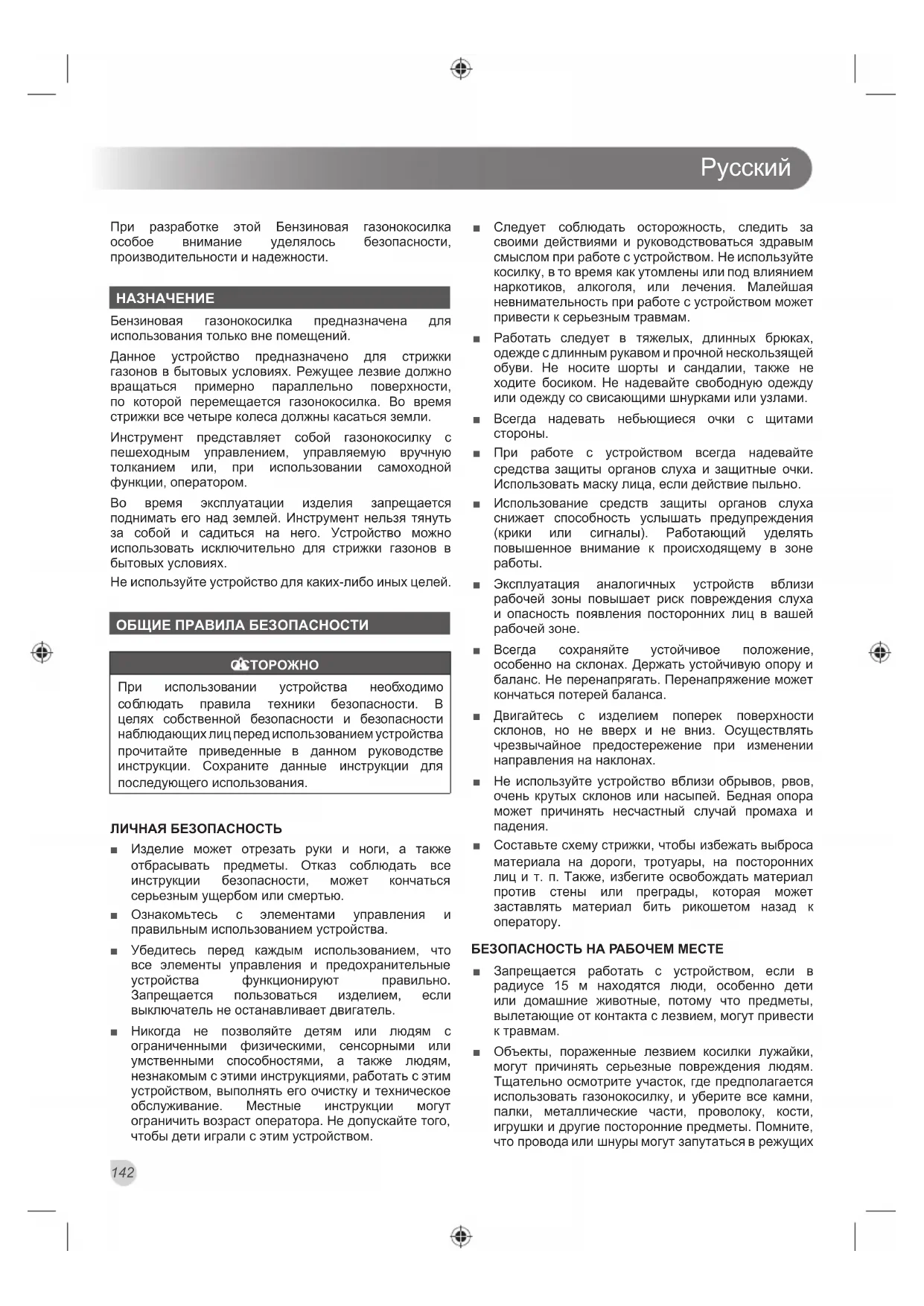 При использовании устройства необходимо соблюдать правила техники безопасности. В целях собственной безопасности и безопасности наблюдающих лиц перед использованием устройства прочитайте приведенные в данном руководстве инструкции. Сохраните данные инструкции для последующего использования. ЛИЧНАЯ БЕЗОПАСНОСТЬ ■ Изделие может отрезать руки и ноги, а также отбрасывать предметы. Отказ соблюдать все инструкции безопасности, может кончаться серьезным ущербом или смертью. ■ Ознакомьтесь с элементами управления и правильным использованием устройства. ■ Убедитесь перед каждым использованием, что все элементы управления и предохранительные устройства функционируют правильно. Запрещается пользоваться изделием, если выключатель не останавливает двигатель. ■ Никогда не позволяйте детям или людям с ограниченными физическими, сенсорными или умственными способностями, а также людям, незнакомым с этими инструкциями, работать с этим устройством, выполнять его очистку и техническое обслуживание. Местные инструкции могут ограничить возраст оператора. Не допускайте того, чтобы дети играли с этим устройством. ■ Следует соблюдать осторожность, следить за своими действиями и руководствоваться здравым смыслом при работе с устройством. Не используйте косилку, в то время как утомлены или под влиянием наркотиков, алкоголя, или лечения. Малейшая невнимательность при работе с устройством может привести к серьезным травмам. ■ Работать следует в тяжелых, длинных брюках, одежде с длинным рукавом и прочной нескользящей обуви. Не носите шорты и сандалии, также не ходите босиком. Не надевайте свободную одежду или одежду со свисающими шнурками или узлами. ■ Всегда надевать небьющиеся очки с щитами
