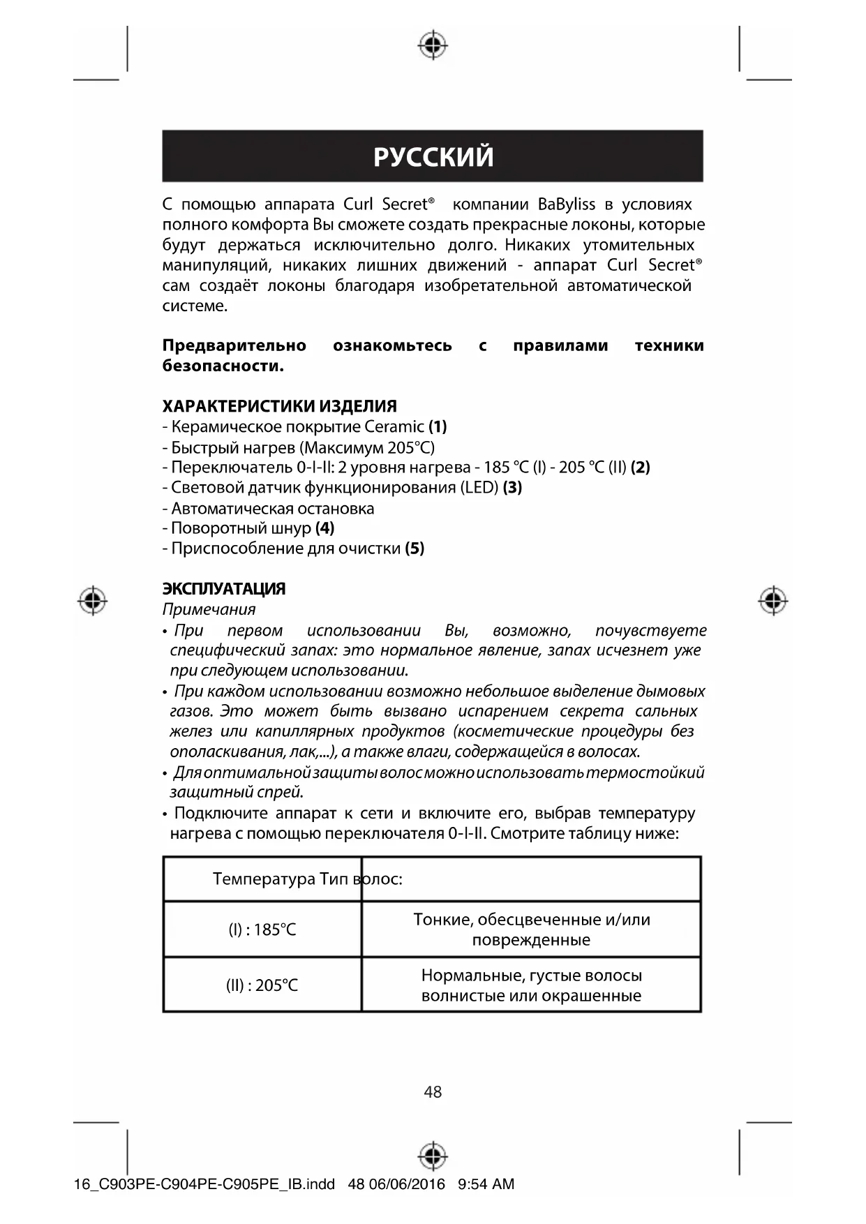 - Подключите аппарат к сети и включите его, выбрав температуру нагрева с помощью переключателя 0-I-II. Смотрите таблицу ниже: Температура Тип волос: (I) : 185°C Тонкие, обесцвеченные и/или поврежденные (II) : 205°C Нормальные, густые волосы волнистые или окрашенные 16_C903PE-C904PE-C905PE_IB.indd 48 06/06/2016 9:54 AM49