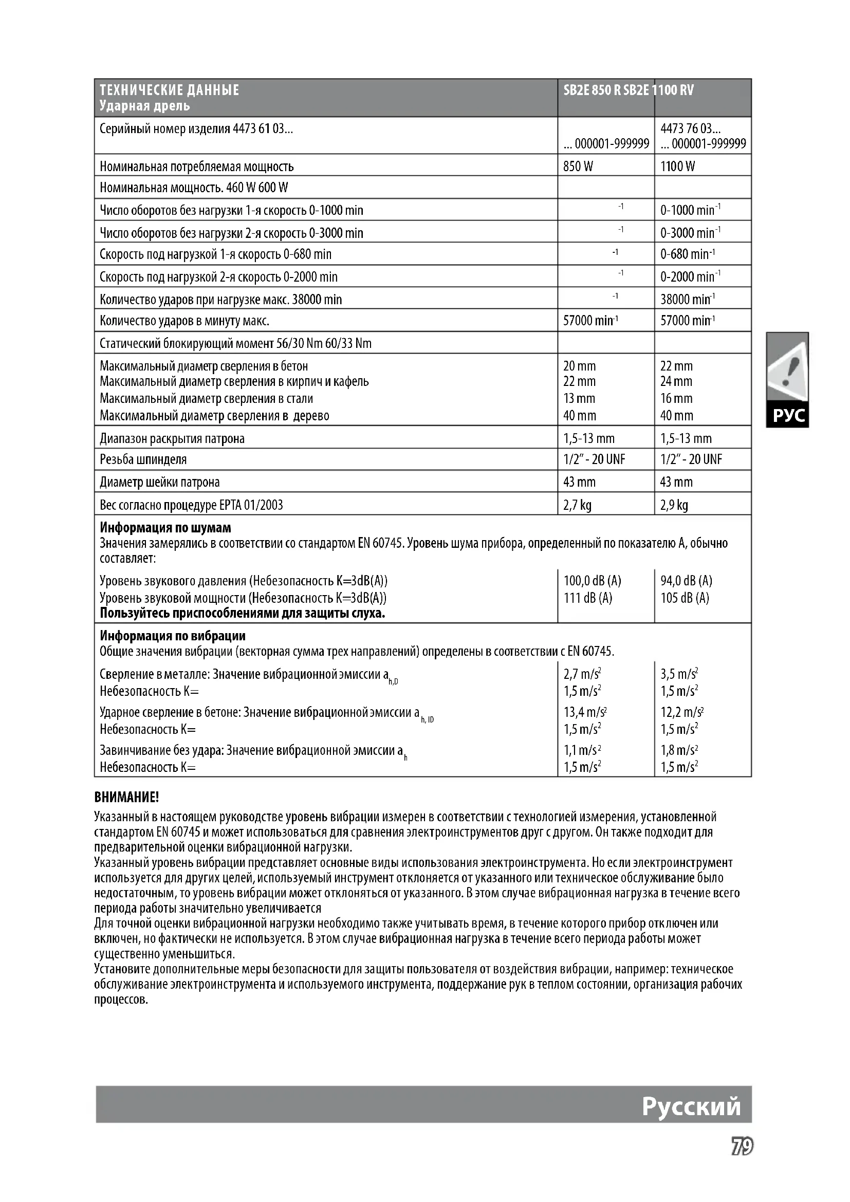 ТЕХНИЧЕСКИЕ ДАННЫЕ Ударная дрель SB2E 850 R SB2E 1100 RV Серийный номер изделия 4473 61 03... ... 000001-999999