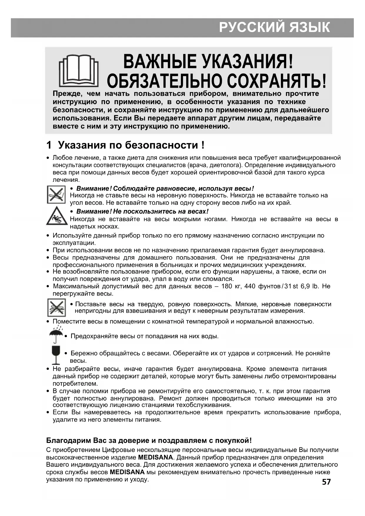 - В случае поломки прибора не ремонтируйте его самостоятельно, т. к. при этом гарантия будет полностью аннулирована. Ремонт должен проводиться только имеющими на этосоответствующую лицензию станциями техобслуживания.• Если Вы намереваетесь на продолжительное время прекратить использование прибора,удалите из него элементы питания. Благодарим Вас за доверие и поздравляем с покупкой! С приобретением Цифровые нескользящие персональные весы индивидуальные Вы получиливысококачественное изделие MEDISANA. Данный прибор предназначен для определенияВашего индивидуального веса. Для достижения желаемого успеха и обеспечения длительного срока службы весов MEDISANA мы рекомендуем внимательно прочесть приведенные ниже указания по применению и уходу.58 РУССКИЙ ЯЗЫК