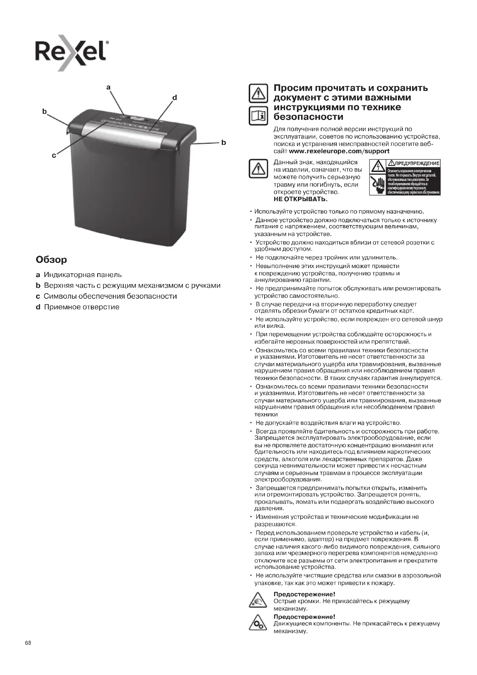 - Используйте устройство только по прямому назначению.• Данное устройство должно подключаться только к источнику питания с напряжением, соответствующим величинам, указанным на устройстве.• Устройство должно находиться вблизи от сетевой розетки с удобным доступом.• Не подключайте через тройник или удлинитель.• Невыполнение этих инструкций может привести к повреждению устройства, получению травмы и аннулированию гарантии.• Не предпринимайте попыток обслуживать или ремонтировать устройство самостоятельно.• В случае передачи на вторичную переработку следует отделять обрезки бумаги от остатков кредитных карт.• Не используйте устройство, если поврежден его сетевой шнур или вилка.• При перемещении устройства соблюдайте осторожность и избегайте неровных поверхностей или препятствий.• Ознакомьтесь со всеми правилами техники безопасности и указаниями. Изготовитель не несет ответственности за случаи материального ущерба или травмирования, вызванные нарушением правил обращения или несоблюдением правил техники безопасности. В таких случаях гарантия аннулируется.• Ознакомьтесь со всеми правилами техники безопасности и указаниями. Изготовитель не несет ответственности за случаи материального ущерба или травмирования, вызванные нарушением правил обращения или несоблюдением правил техники• Не допускайте воздействия влаги на устройство.• Всегда проявляйте бдительность и осторожность при работе. Запрещается эксплуатировать электрооборудование, если вы не проявляете достаточную концентрацию внимания или бдительность или находитесь под влиянием наркотических средств, алкоголя или лекарственных препаратов. Даже секунда невнимательности может привести к несчастным случаям и серьезным травмам в процессе эксплуатации электрооборудования.• Запрещается предпринимать попытки открыть, изменить или отремонтировать устройство. Запрещается ронять, прокалывать, ломать или подвергать воздействию высокого давления.• Изменения устройства и технические модификации не разрешаются.• Перед использованием проверьте устройство и кабель (и, если применимо, адаптер) на предмет повреждения. В случае наличия какого-либо видимого повреждения, сильного запаха или чрезмерного перегрева компонентов немедленно отключите все разъемы от сети электропитания и прекратите использование устройства.• Не используйте чистящие средства или смазки в аэрозольной упаковке, так как это может привести к пожару. Просим прочитать и сохранить документ с этими важными инструкциями по технике безопасности Для получения полной версии инструкций по эксплуатации, советов по использованию устройства, поиска и устранения неисправностей посетите веб- сайт www.rexeleurope.com/support Данный знак, находящийся на изделии, означает, что вы можете получить серьезную травму или погибнуть, если откроете устройство. НЕ ОТКРЫВАТЬ. Опасность поражения электрическим током. Не открывать. Внутри нет деталей, обслуживаемых пользователем. За техобслуживанием обращайтесь к квалифицированному персоналу, обеспечивающему сервисное обслуживание. ПРЕДУПРЕЖДЕНИЕ