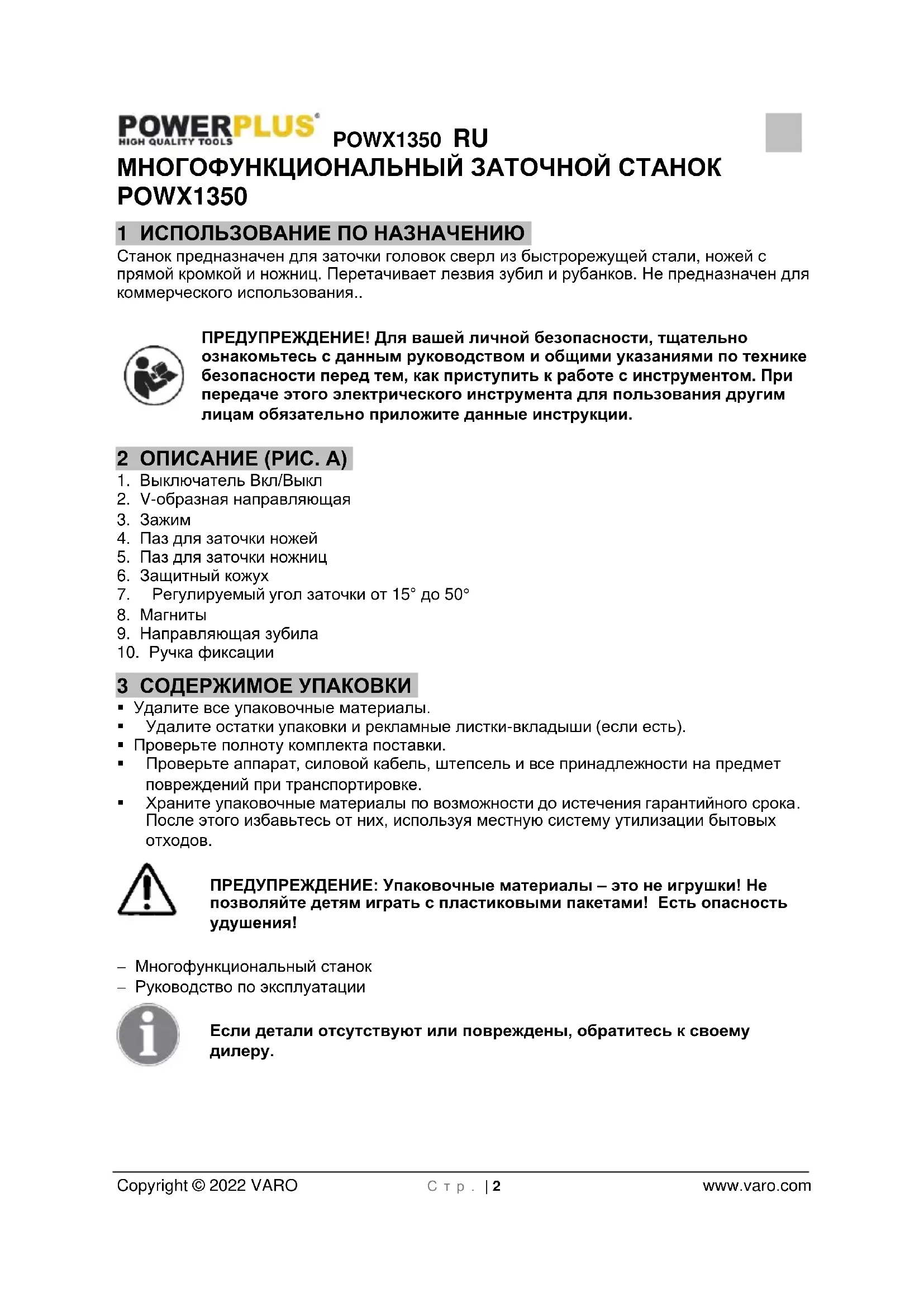 - 15 ДЕКЛАРАЦИЯ О СООТВЕТСТВИИ POWX1350 RU Copyright © 2022 VARO С т р . | 2 www.varo.com МНОГОФУНКЦИОНАЛЬНЫЙ ЗАТОЧНОЙ СТАНОК POWX1350 1 ИСПОЛЬЗОВАНИЕ ПО НАЗНАЧЕНИЮ Станок предназначен для заточки головок сверл из быстрорежущей стали, ножей с прямой кромкой и ножниц. Перетачивает лезвия зубил и рубанков. Не предназначен для коммерческого использования ПРЕДУПРЕЖДЕНИЕ! Для вашей личной безопасности, тщательно ознакомьтесь с данным руководством и общими указаниями по технике безопасности перед тем, как приступить к работе с инструментом. При передаче этого электрического инструмента для пользования другим лицам обязательно приложите данные инструкции. 2 ОПИСАНИЕ (РИС. A) p. 10