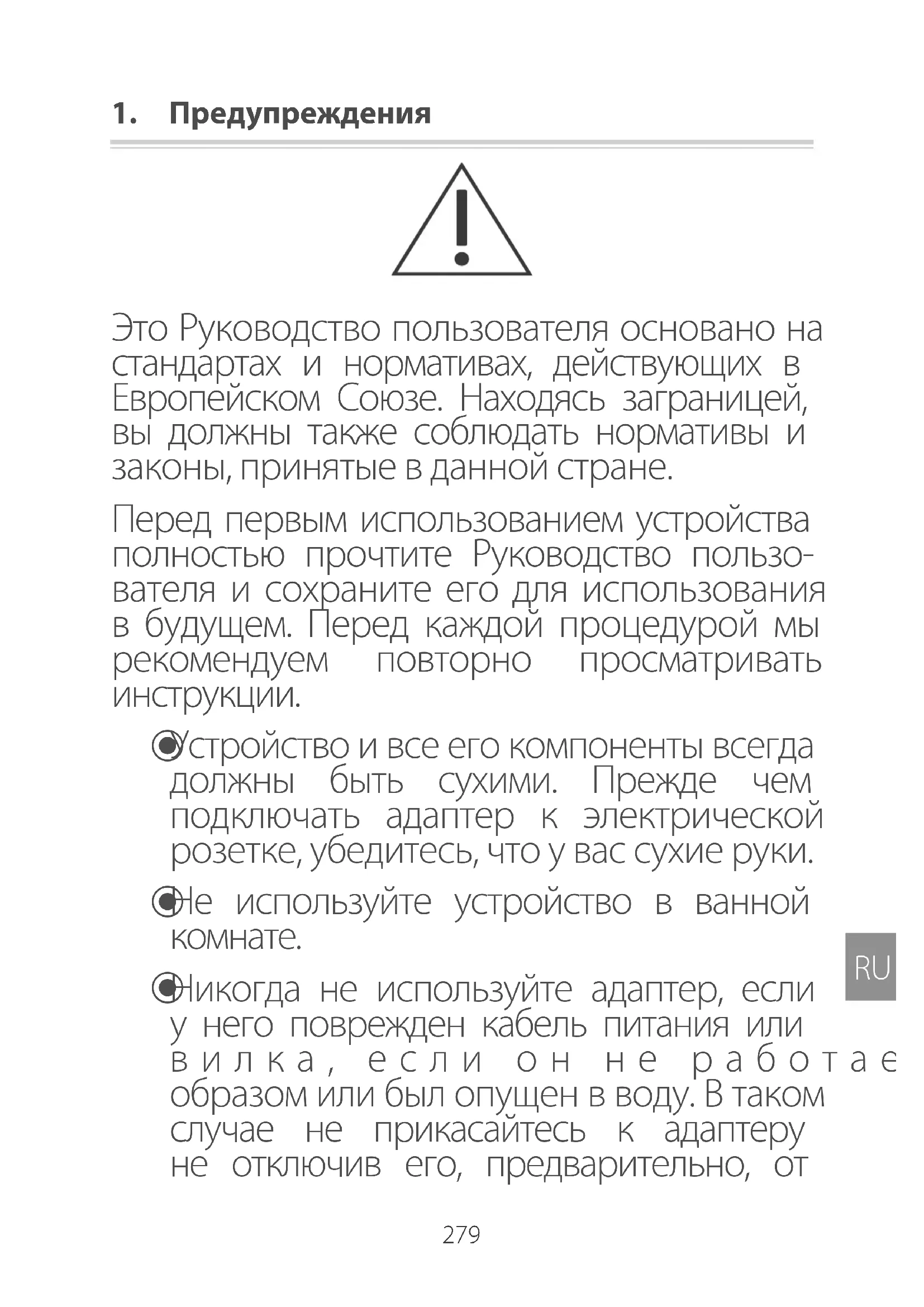 ☑стройство и все его компоненты всегда должны быть сухими. Прежде чем подключать адаптер к электрической розетке, убедитесь, что у вас сухие руки.
