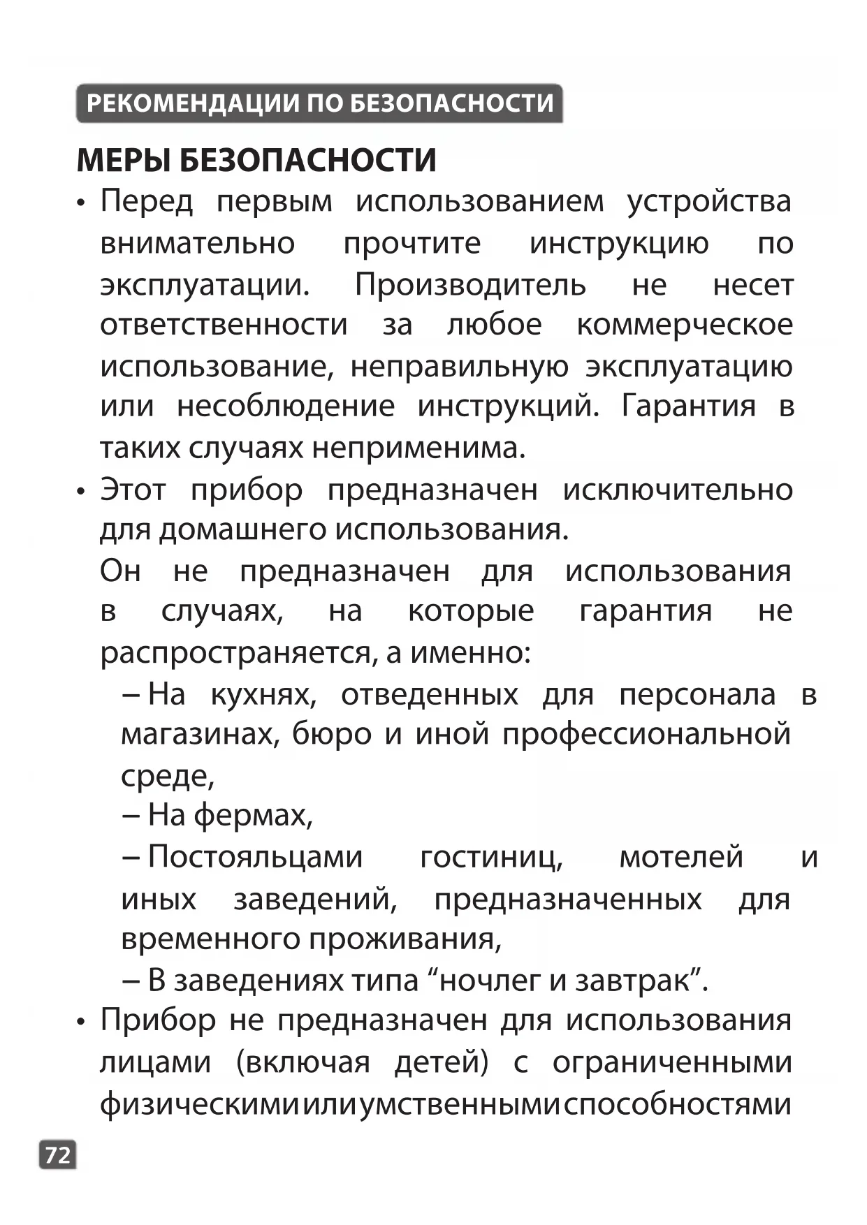- Этот прибор предназначен исключительно для домашнего использования. Он не предназначен для использования в случаях, на которые гарантия не распространяется, а именно: – На кухнях, отведенных для персонала в магазинах, бюро и иной профессиональной