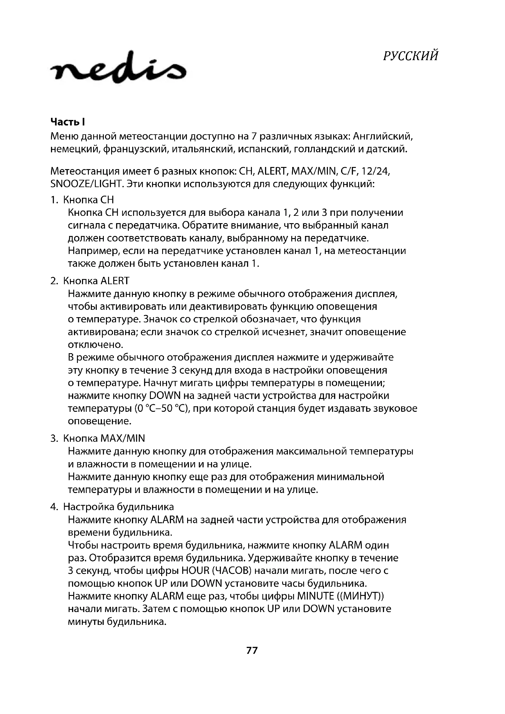 Часть I Меню данной метеостанции доступно на 7 различных языках: Английский, немецкий, французский, итальянский, испанский, голландский и датский. Метеостанция имеет 6 разных кнопок: CH, ALERT, MAX/MIN, C/F, 12/24, SNOOZE/LIGHT. Эти кнопки используются для следующих функций: