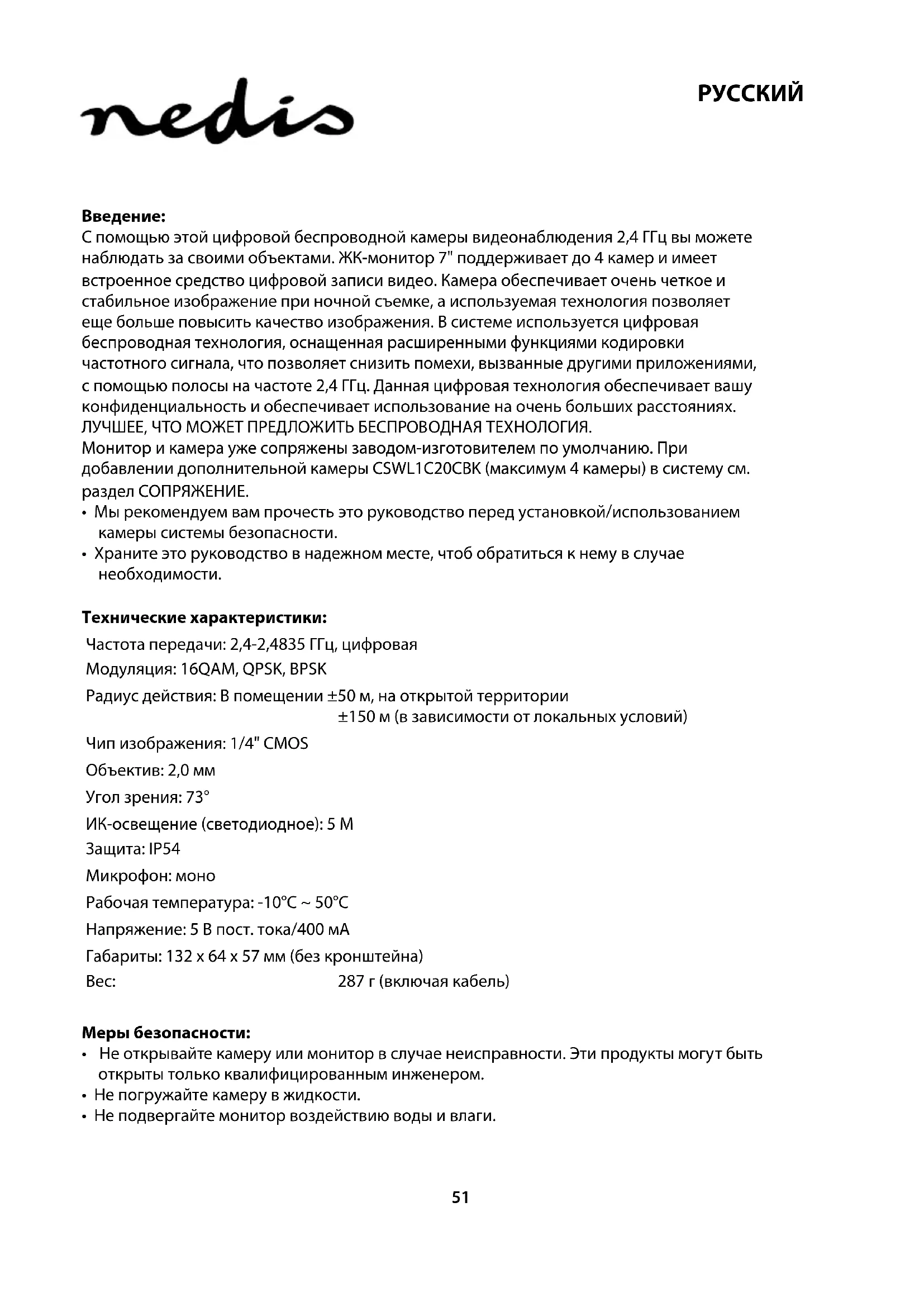 - Храните это руководство в надежном месте, чтоб обратиться к нему в случае необходимости. Технические характеристики: Частота передачи: 2,4-2,4835 ГГц, цифровая Модуляция: 16QAM, QPSK, BPSK Радиус действия: В помещении ±50 м, на открытой территории ±150м (в зависимости от локальных условий) Чип изображения: 1/4" CMOS Объектив: 2,0 мм Угол зрения: 73° ИК-освещение (светодиодное): 5 M Защита: IP54 Микрофон: моно Рабочая температура: -10°C ~ 50°C Напряжение: 5 В пост. тока/400 мА Габариты: 132 x 64 x 57 мм (без кронштейна) Вес: 287 г (включая кабель) Меры безопасности: