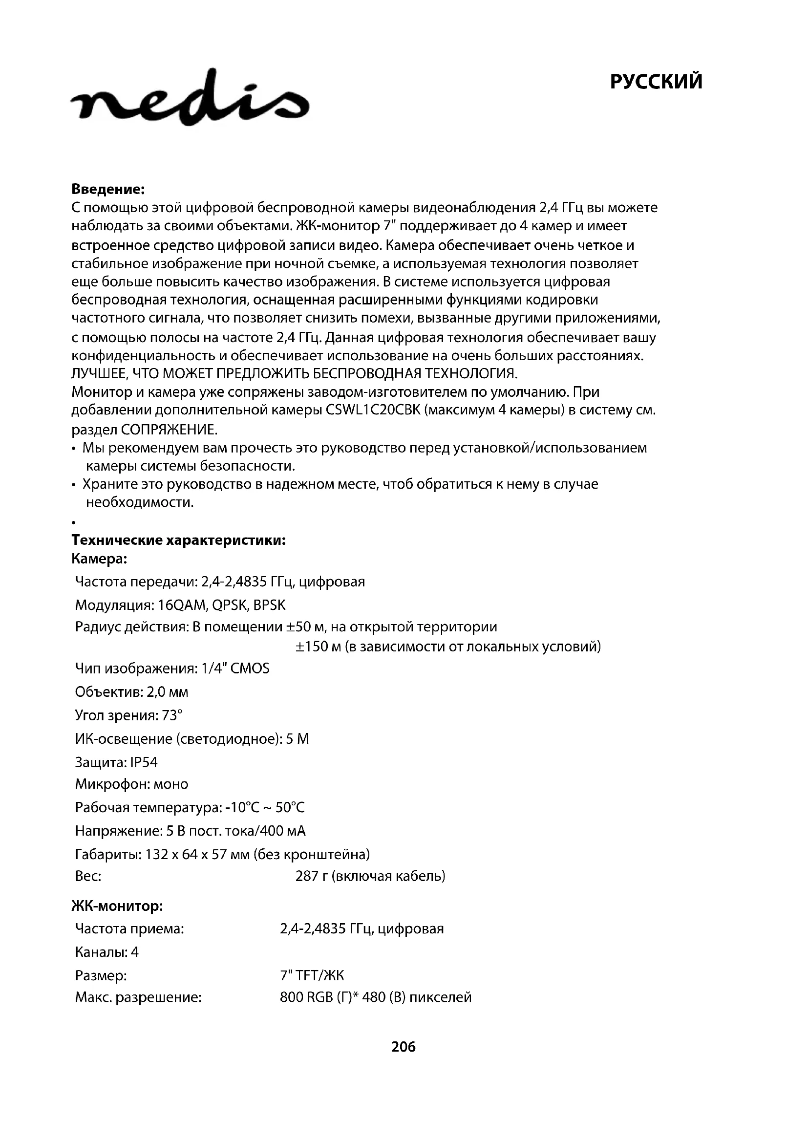 Частота передачи: 2,4-2,4835 ГГц, цифровая Модуляция: 16QAM, QPSK, BPSK Радиус действия: В помещении ±50 м, на открытой территории ±150м (в зависимости от локальных условий) Чип изображения: 1/4" CMOS Объектив: 2,0 мм Угол зрения: 73° ИК-освещение (светодиодное): 5 M Защита: IP54 Микрофон: моно Рабочая температура: -10°C ~ 50°C Напряжение: 5 В пост. тока/400 мА Габариты: 132 x 64 x 57 мм (без кронштейна) Вес: 287 г (включая кабель) ЖК-монитор: Частота приема: 2,4-2,4835 ГГц, цифровая Каналы: 4 Размер: 7" TFT/ЖК Макс. разрешение: 800 RGB (Г)* 480 (В) пикселей207