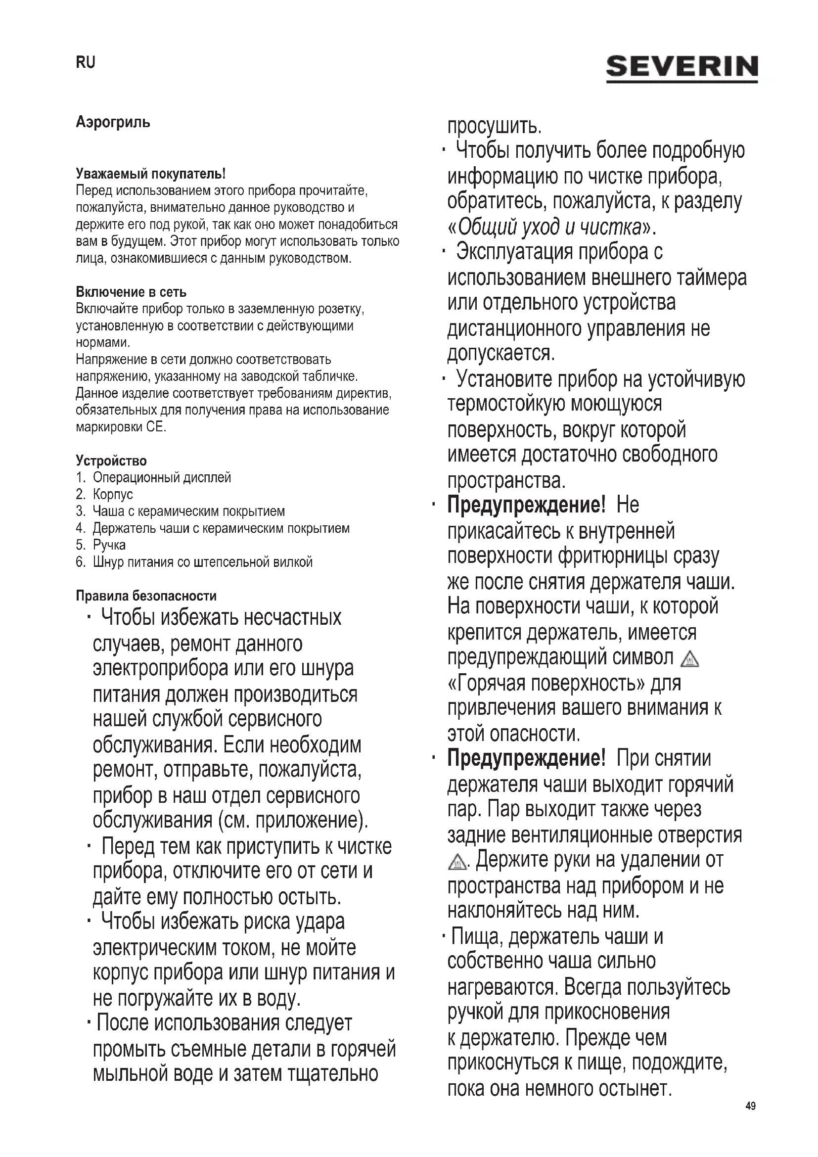 Правила безопасности ∙ Чтобы избежать несчастных случаев, ремонт данного электроприбора или его шнура питания должен производиться нашей службой сервисного обслуживания. Если необходим ремонт, отправьте, пожалуйста, прибор в наш отдел сервисного обслуживания (см. приложение). ∙ Перед тем как приступить к чистке прибора, отключите его от сети и дайте ему полностью остыть. ∙ Чтобы избежать риска удара электрическим током, не мойте корпус прибора или шнур питания и не погружайте их в воду. ∙ После использования следует промыть съемные детали в горячей мыльной воде и затем тщательно
