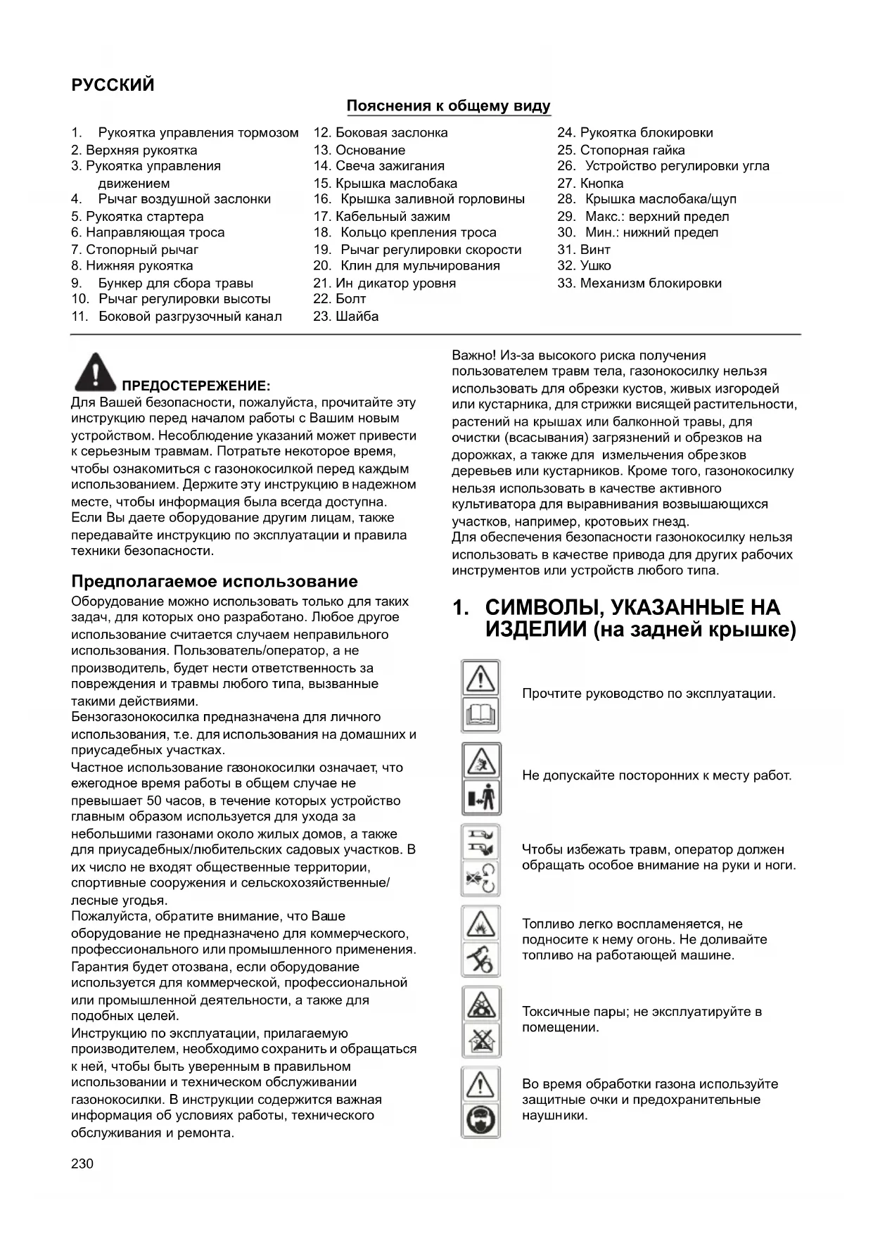 Пояснения к общему виду ПРЕДОСТЕРЕЖЕНИЕ: Для Вашей безопасности, пожалуйста, прочитайте эту инструкцию перед началом работы с Вашим новым устройством. Несоблюдение указаний может привести к серьезным травмам. Потратьте некоторое время, чтобы ознакомиться с газонокосилкой перед каждым использованием. Держите эту инструкцию в надежном месте, чтобы информация была всегда доступна. Если Вы даете оборудование другим лицам, также передавайте инс трукцию по эксплуатации и правила техники безопасности. Предполагаемое использование Оборудование можно использовать только для таких задач, для которых оно разработано. Любое другое использование считается случаем неправильного использования. Пользователь/оператор, а не производитель, будет нести ответственность за повреждения и травмы любого типа, вызванные такими действиями. Бензогазонокосилка предназначена для личного использования, т.е. для использования на домашних и приусадебных участках. Частное использование га зонокосилки означает, что ежегодное время работы в общем случае не превышает 50 часов, в течение которых устройство главным образом используется для ухода за небольшими газонами около жилых домов, а также для приусадебных/любительских садовых участков. В их число не входят общественные территории, спортивные сооружения и сельскохозяйственные/ лесные угодья. Пожалуйста, обратите внимание, что Ва