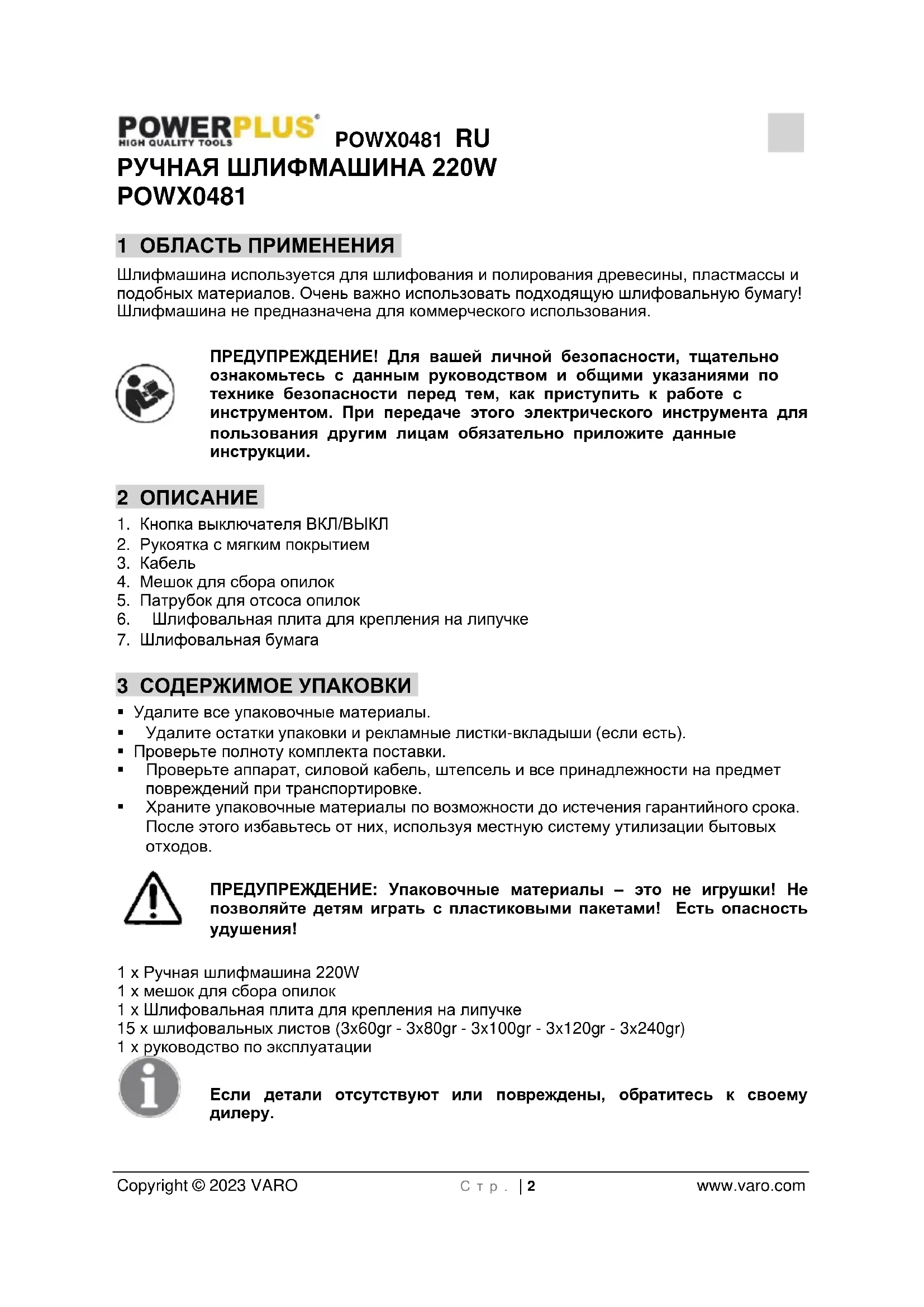 - 15 ДЕКЛАРАЦИЯ СООТВЕТСТВИЯ POWX0481 RU Copyright © 2023 VARO С т р . | 2 www.varo.com РУЧНАЯ ШЛИФМАШИНА 220W POWX0481 1 ОБЛАСТЬ ПРИМЕНЕНИЯ Шлифмашина используется для шлифования и полирования древесины, пластмассы и подобных материалов. Очень важно использовать подходящую шлифовальную бумагу! Шлифмашина не предназначена для коммерческого использования. ПРЕДУПРЕЖДЕНИЕ! Для вашей личной безопасности, тщательно ознакомьтесь с данным руководством и общими указаниями по технике безопасности перед тем, как приступить к работе с инструментом. При передаче этого электрического инструмента для пользования другим лицам обязательно приложите данные инструкции. 2 ОПИСАНИЕ p. 9