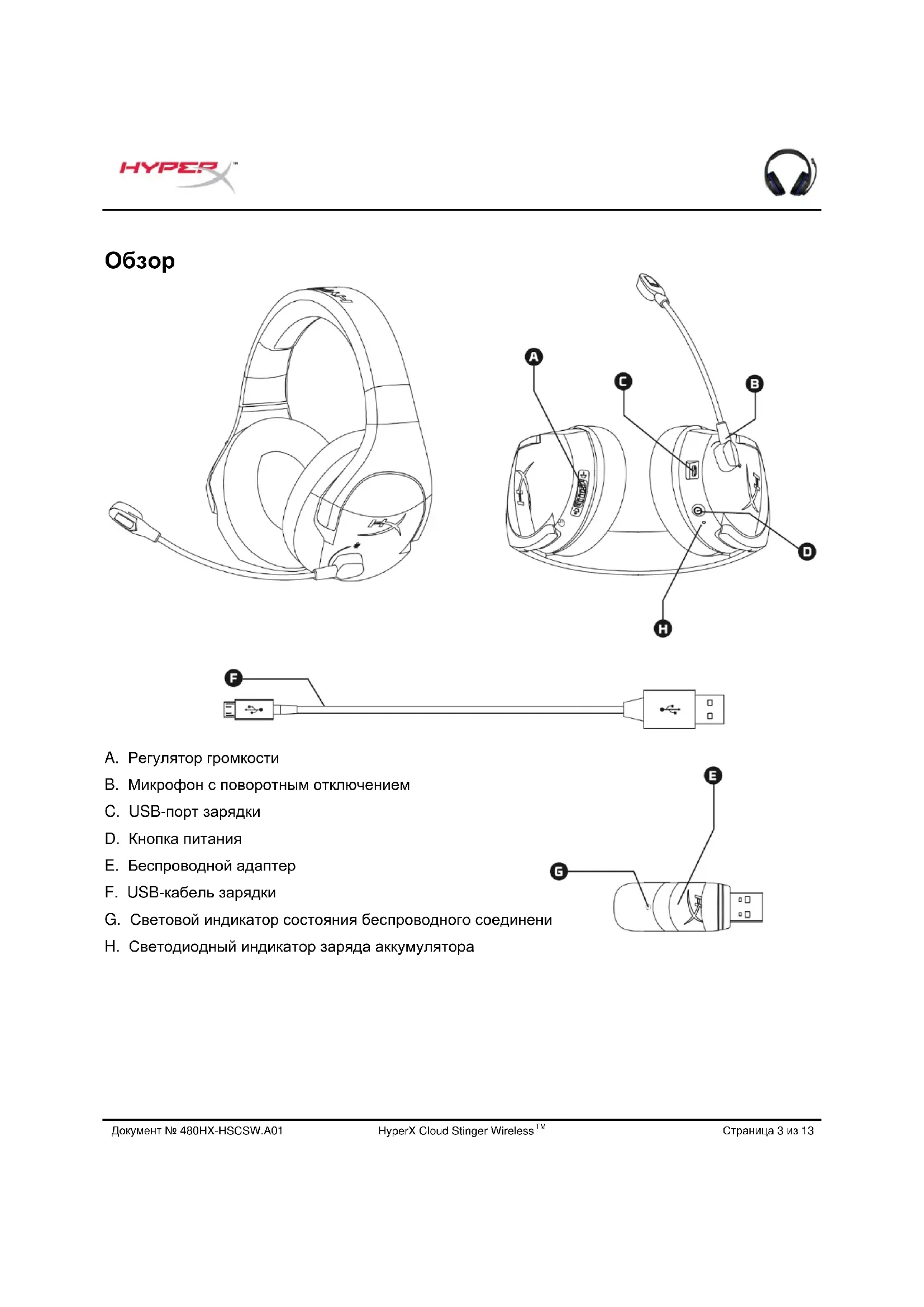 A. Регулятор громкости B. Микрофон с поворотным отключением C. USB-порт зарядки D. Кнопка питания E. Беспроводной адаптер F. USB-кабель зарядки G. Световой индикатор состояния беспроводного соединения H. Светодиодный индикатор заряда аккумулятораДокумент № 480HX-HSCSW.A01 HyperX Cloud Stinger Wireless