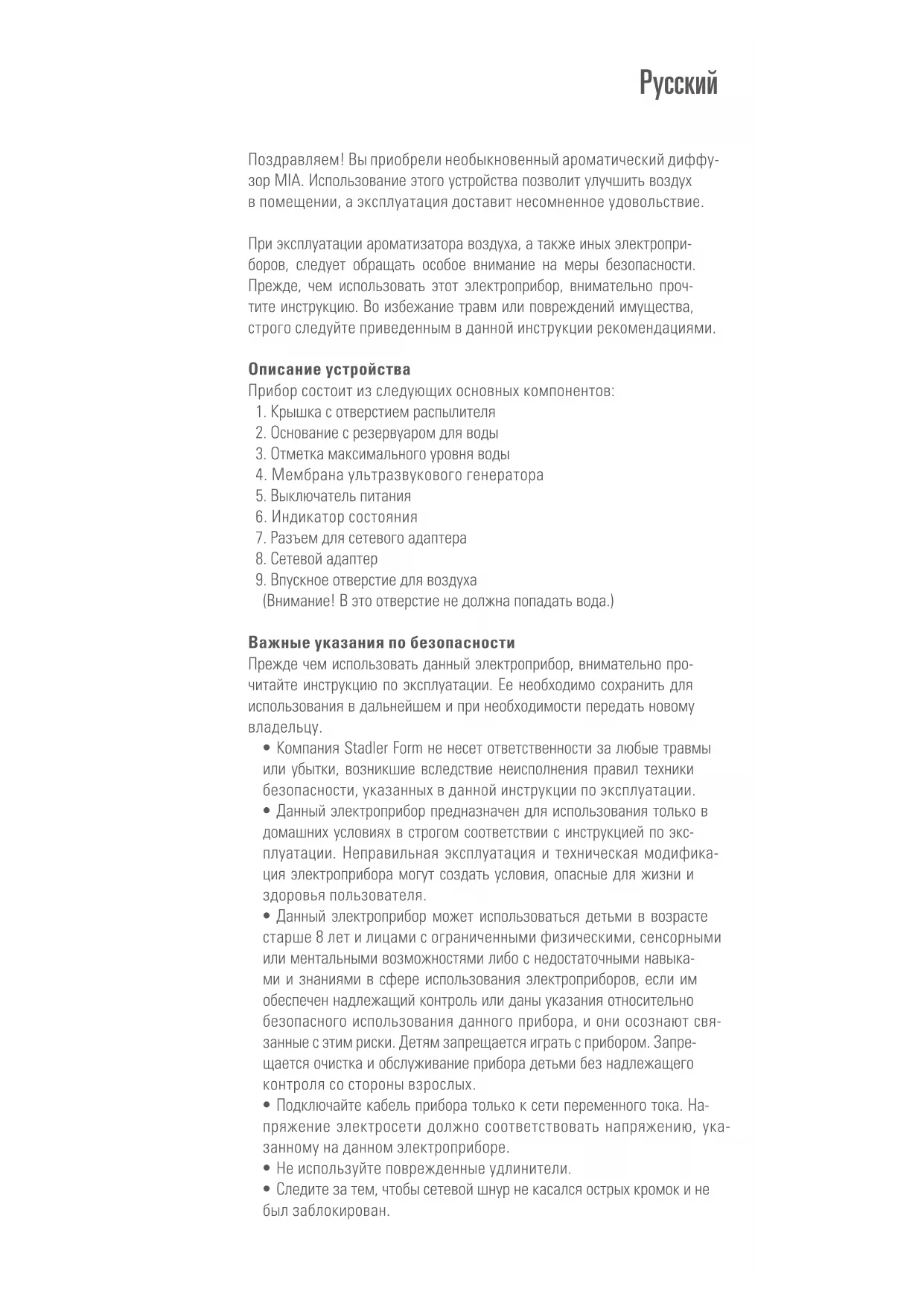 Mia - Аромадиффузор STADLER FORM - Бесплатное руководство пользователя