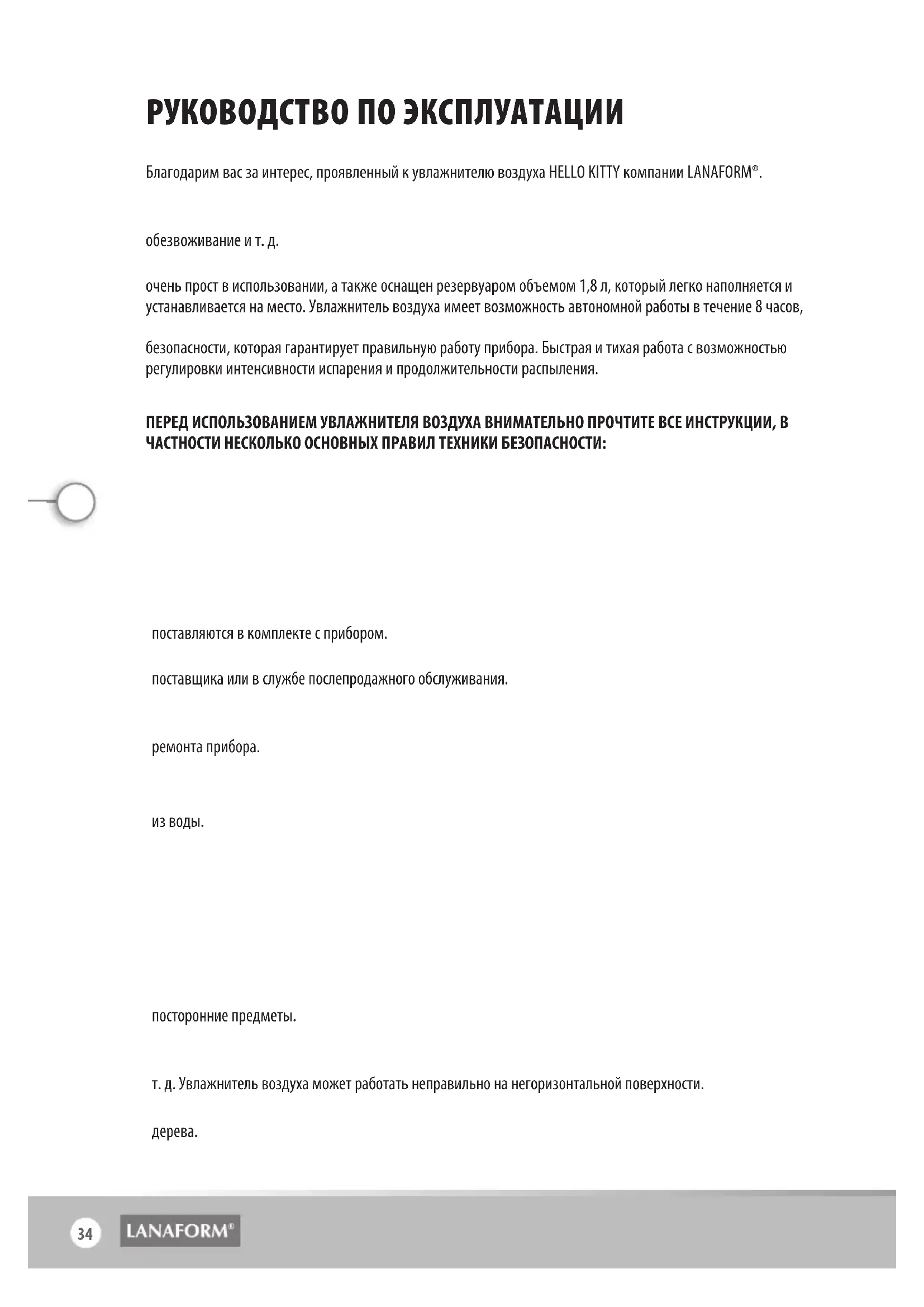 Скачайте инструкцию для вашего Увлажнитель в формате PDF бесплатно! Найдите своё руководство Hello Kitty - LANAFORM и возьмите своё электронное устройство обратно в руки. На этой странице опубликованы все документы, необходимые для использования вашего устройства. Hello Kitty бренда LANAFORM.