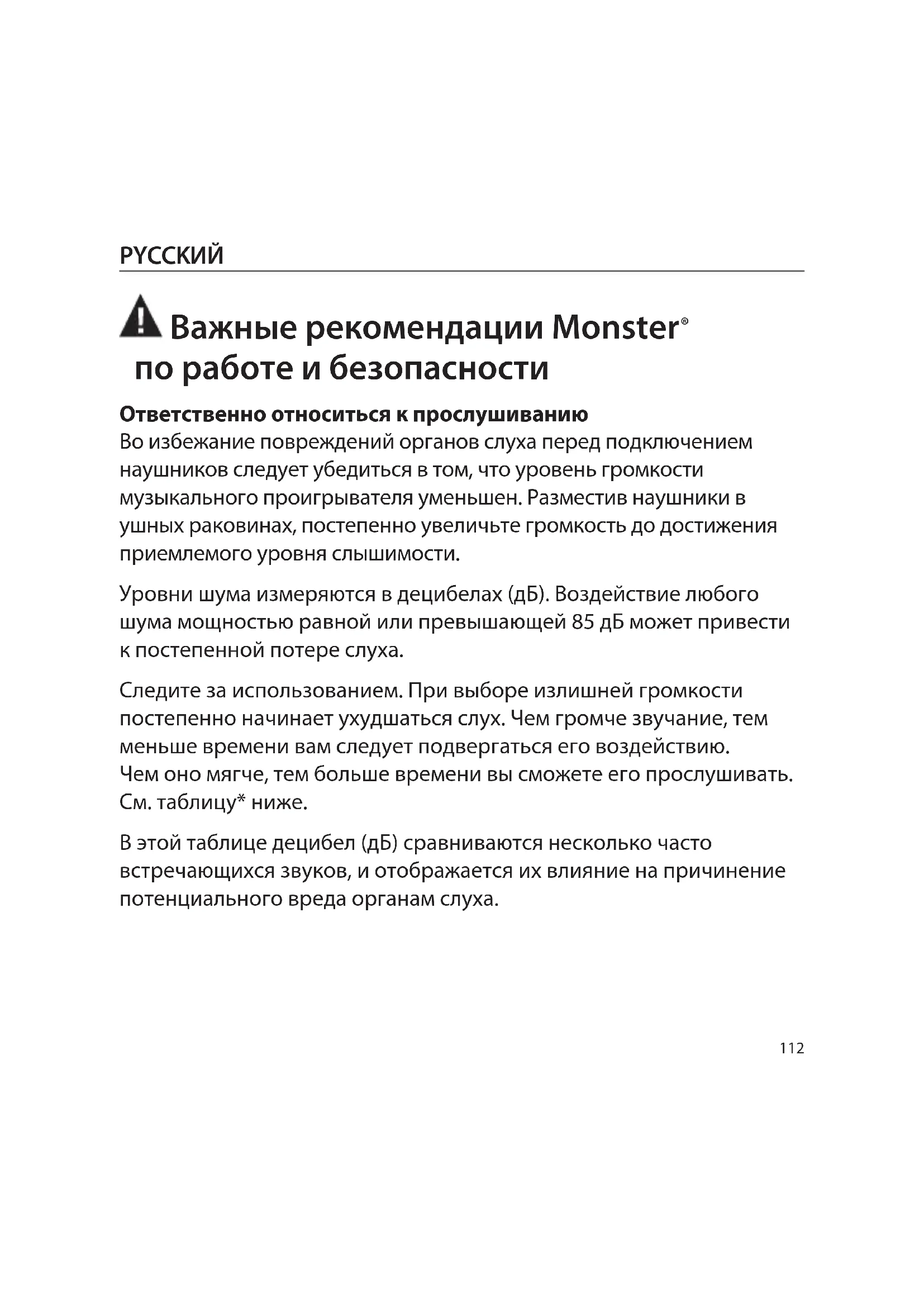 PYCCKИЙ“…. обычный человек может без опасения слушать iPod в течение 4,6 часов в день при уровне громкости в 70%”. “…. очень важно знать на каких уровнях громкости и в течение которого времени кто-либо слушает музыку”. С сайта http://www.cbc.ca/health/story/2006/10/19/music-earphones.html Воспользуйтесь всеми возможностями вашего оборудования и наслаждайтесь производительностью звучания даже на безопасных уровнях. Наши наушники помогут вам расслышать детали даже на более низком уровне громкости. Физиология уха и слуха Для получения дополнительной информации о том, какое воздействие оказывают громкие звуки на ваши уши, а также ссылки на таблицу, перейдите по следующему адресу http://www.abelard.org/hear/hear.php#loud-music