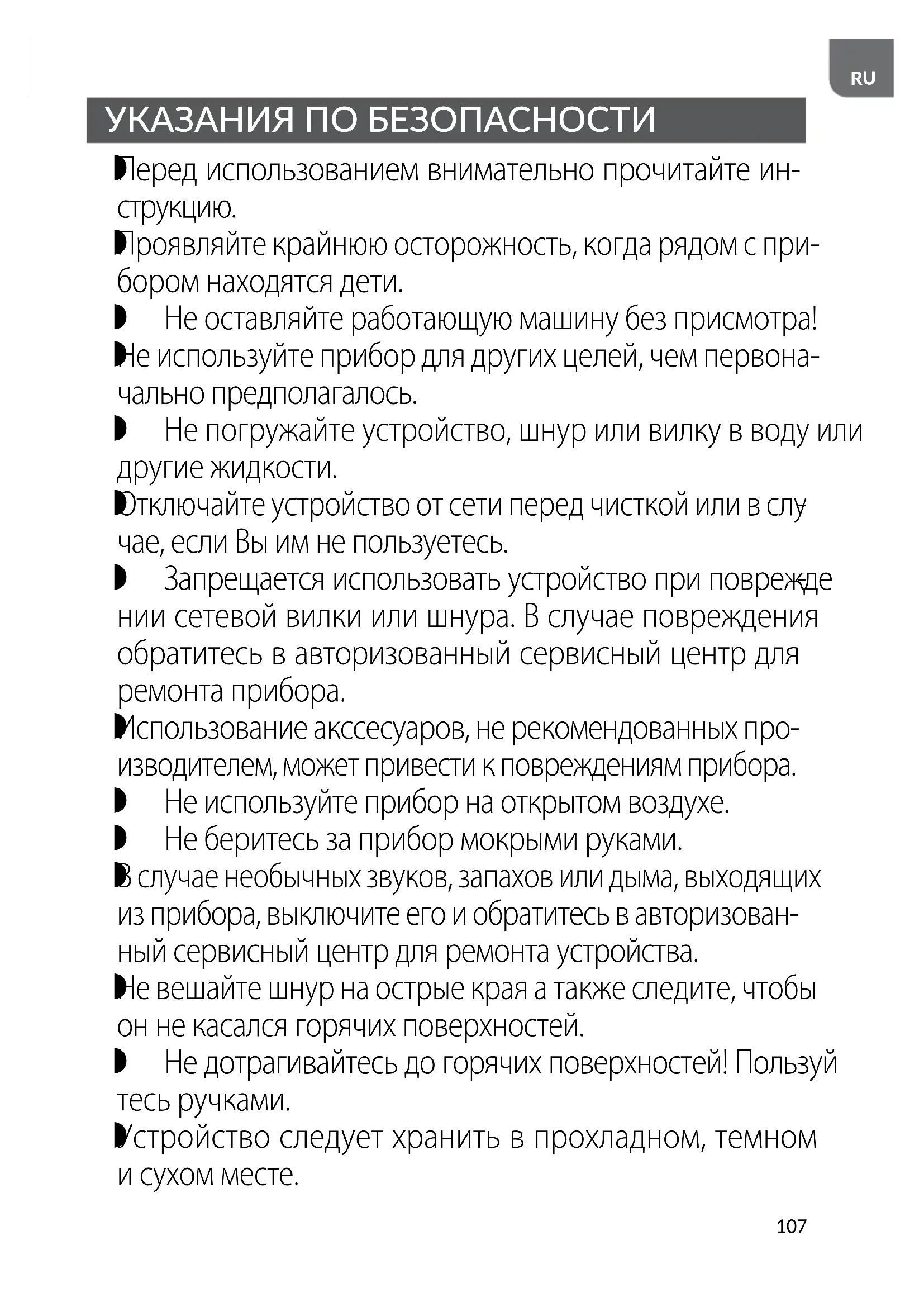 Использование акссесуаров, не рекомендованных про- изводителем, может привести к повреждениям прибора. Не используйте прибор на открытом воздухе. Не беритесь за прибор мокрыми руками.